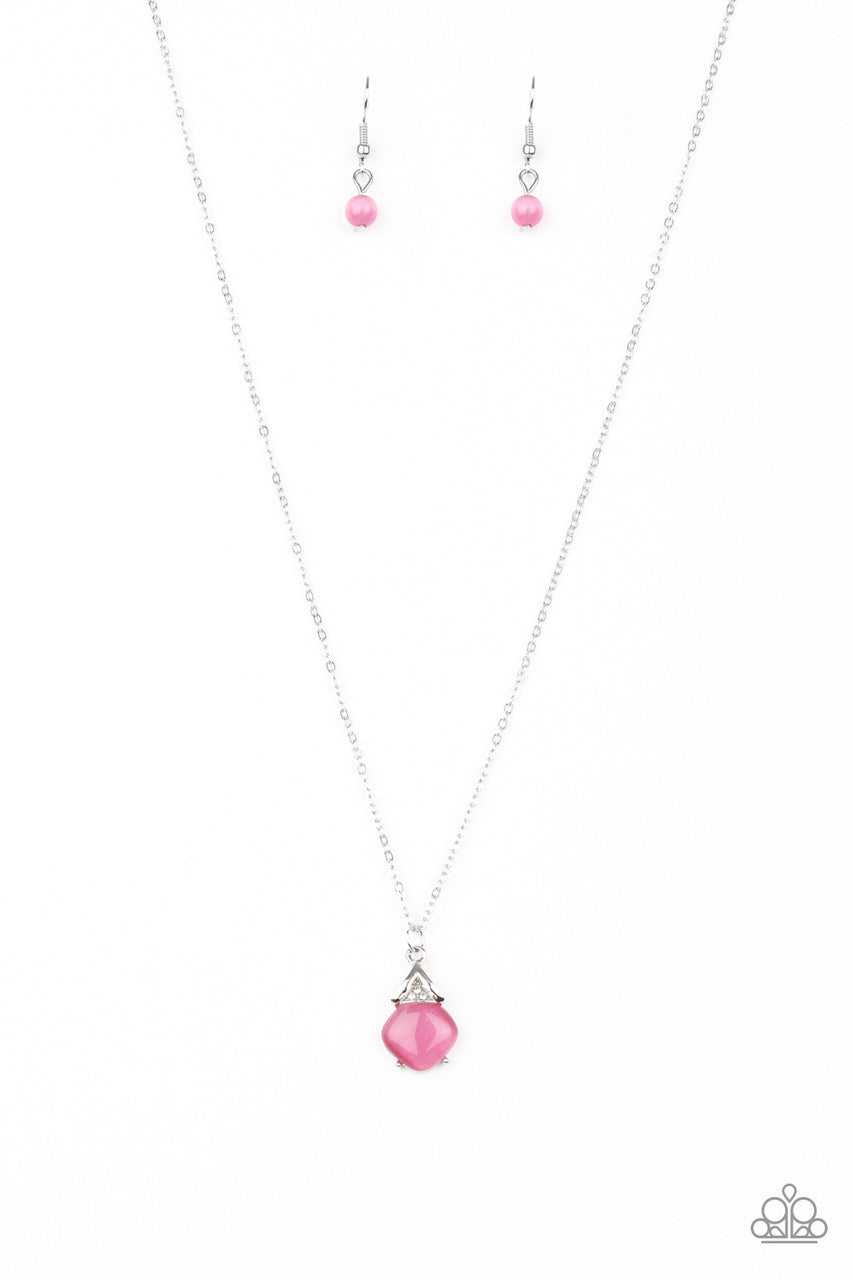 A glowing pink cat's eye stone is capped in a white rhinestone encrusted triangular frame, creating a timeless pendant below the collar. Features an adjustable clasp closure.