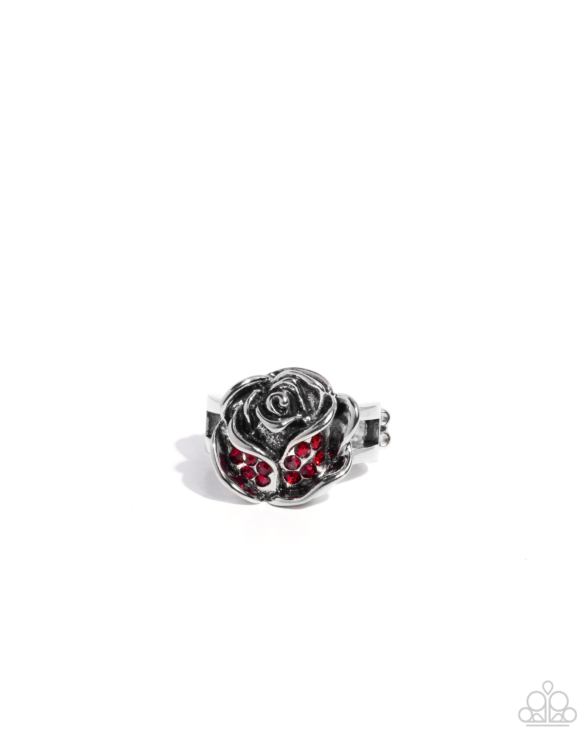 A charming rose-shaped frame sits atop the finger. Delicate red rhinestones are nestled within the petals, adding a subtle sparkle and romantic flair. Features a stretchy band for a flexible fit.