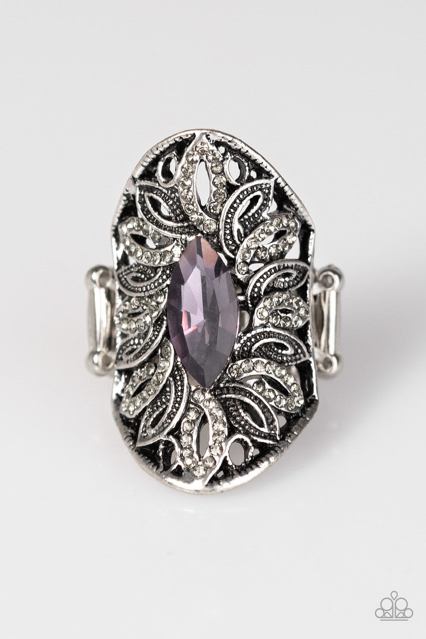 Shimmery silver petals bloom from a glittery purple center, creating a regal foliage pattern. Smoky rhinestones are sprinkled across the swirling frame, adding sparkling accents to the refined piece. Features a stretchy band for a flexible fit.