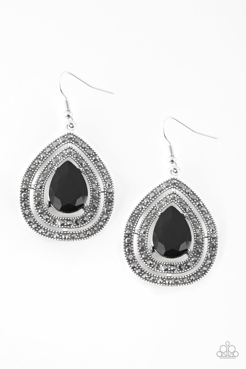 A dramatic black teardrop gem is pressed into the center of a rippling silver frame radiating with glittery hematite rhinestones for a regal look. Earring attaches to a standard fishhook fitting.