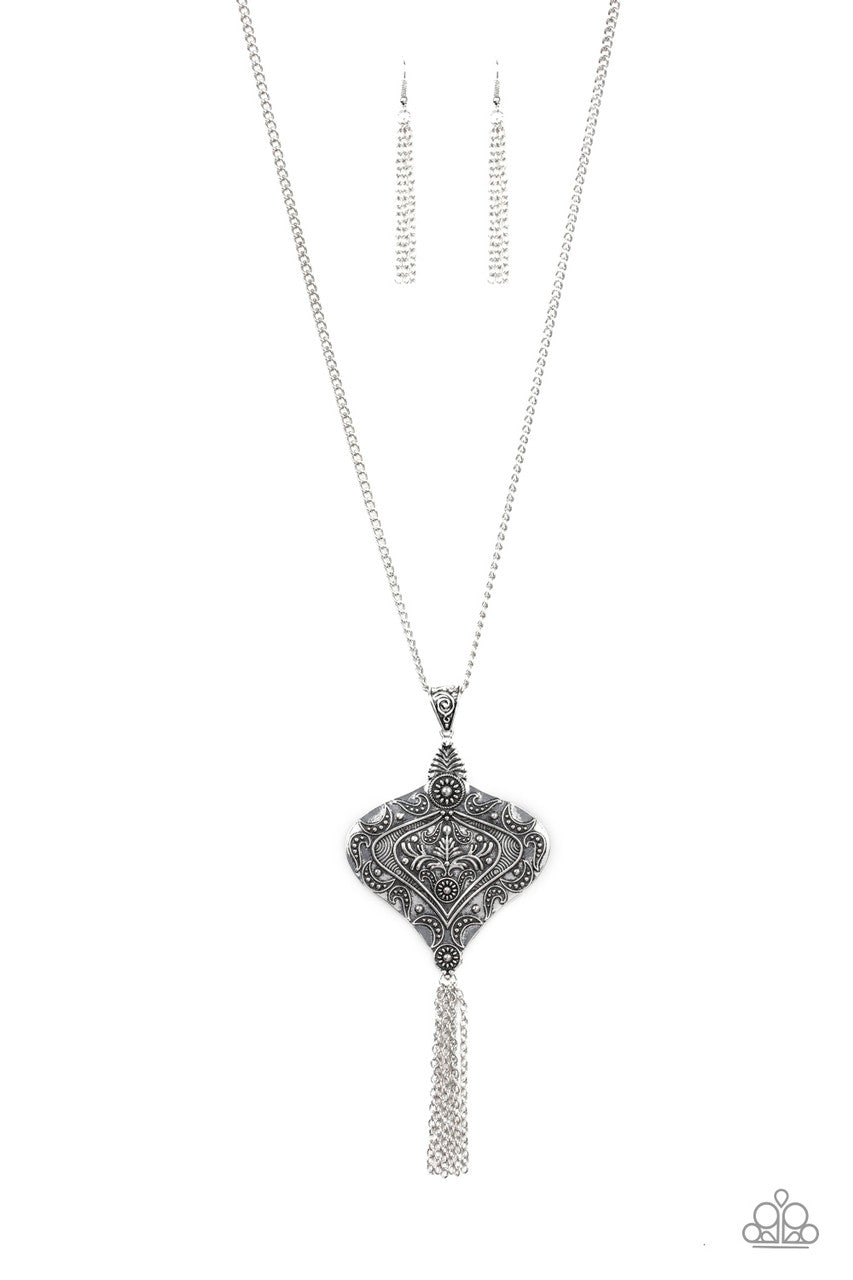 Embossed and studded in ornate details, an oversized silver pendant swings from the bottom of a lengthened silver chain for a rustic look. Antiqued silver chains stream from the bottom of the decorative frame, adding dramatic length to the seasonal piece. Features an adjustable clasp closure.