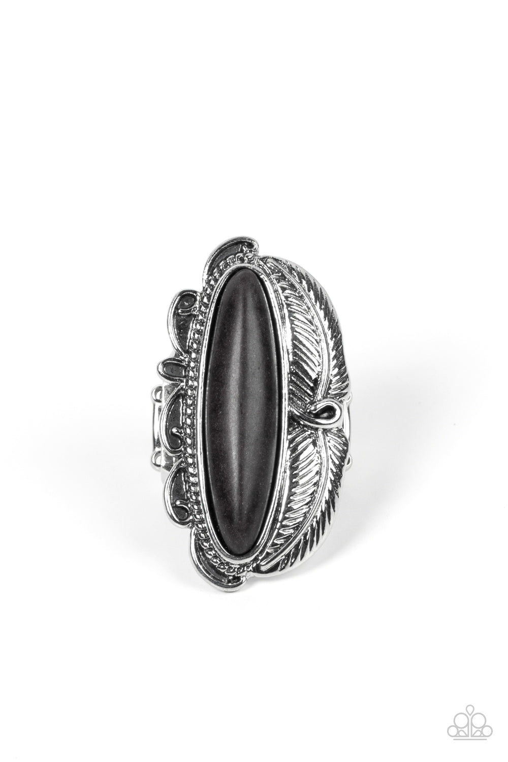 Leafy silver feathers and scalloped silver accents delicately envelops an oblong black stone atop a studded silver frame, resulting in a colorfully rustic centerpiece atop the finger. Features a stretchy band for a flexible fit.