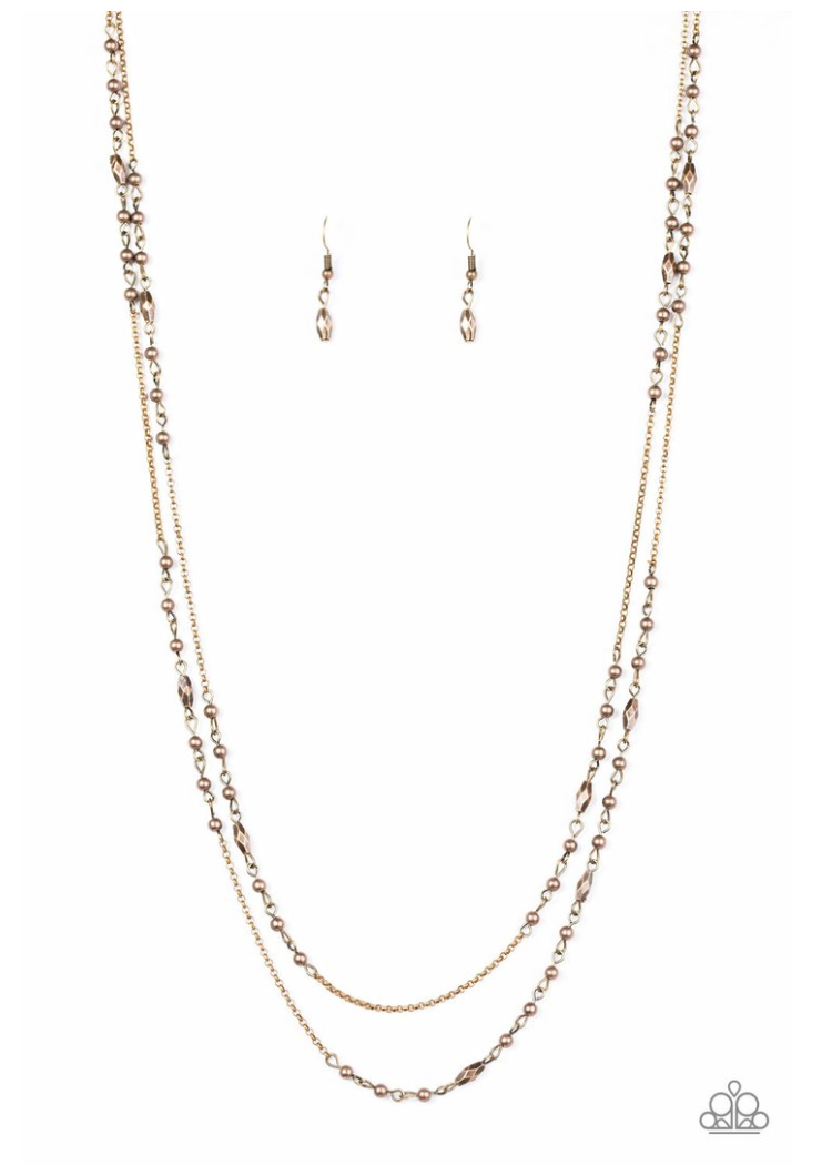 Dainty brass beads and faceted accents trickle along two strands of glistening silver chain, creating a rustic tone on tone palette. Features an adjustable clasp closure.