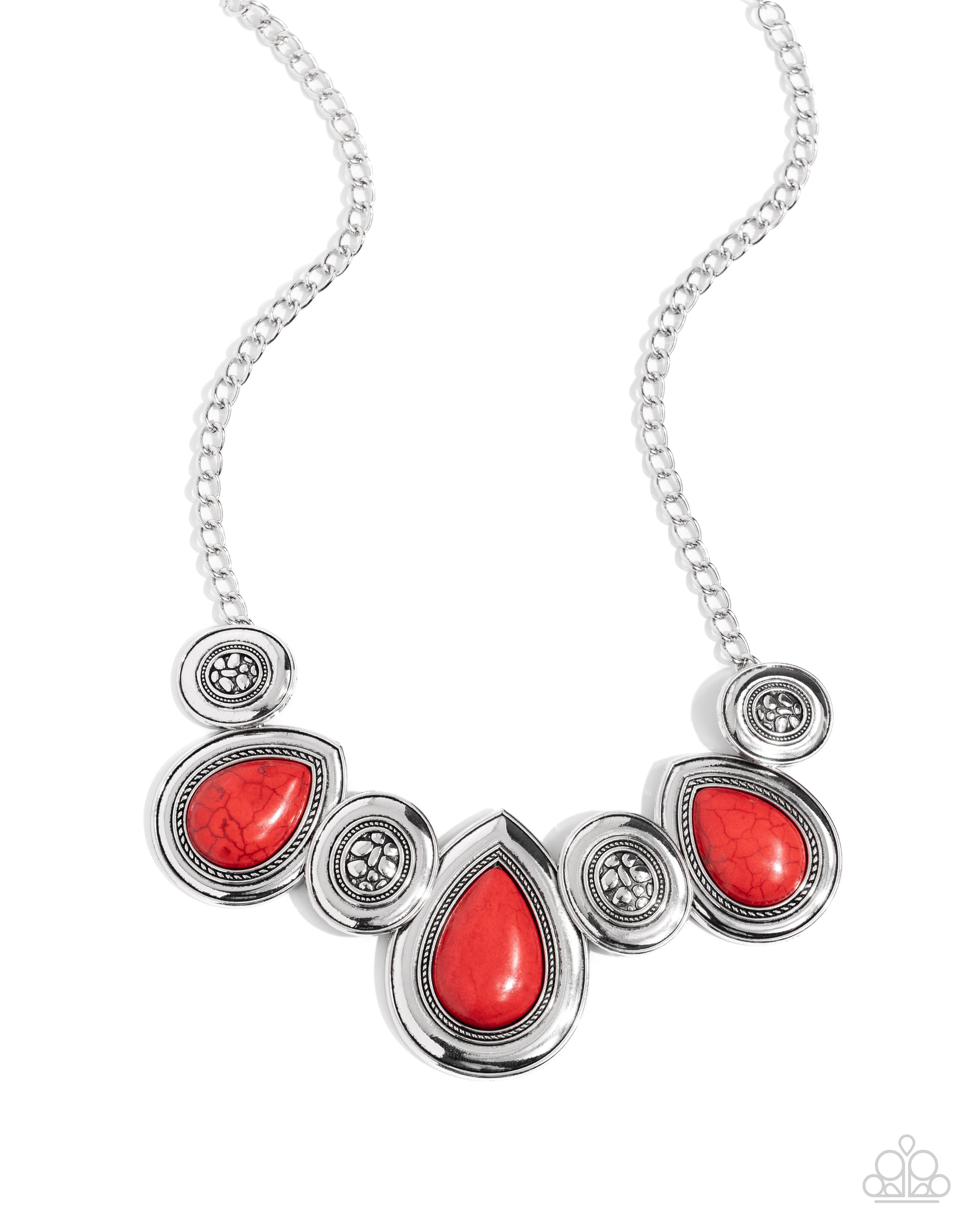 A textured collection of oversized red stone teardrops in rope-textured frames and oval discs embossed in a pebble-like texture interconnect across the neckline from a bold silver chain, creating an earthy, rustic display below the collar. Features an adjustable clasp closure. As the stone elements in this piece are natural, some color variation is normal.
