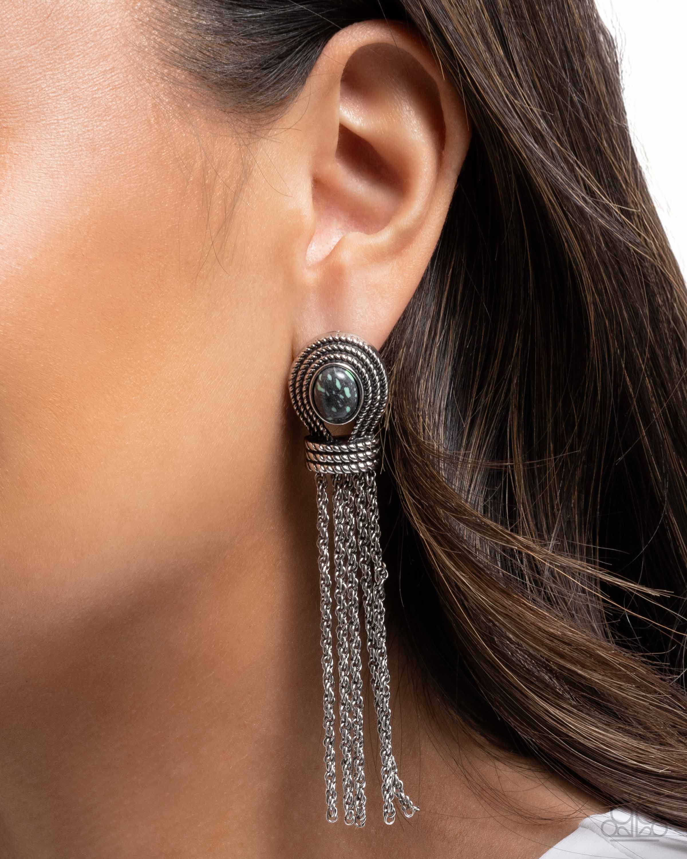 Featuring a green-marbled effect, a black stone nestled in an intricately textured silver frame adds a touch of Western-inspired chic to any look. Multiple strands of silver chains cascade from the base, creating an elegant and dynamic fringe. Earring attaches to a standard post fitting. As the stone elements in this piece are natural, some color variation is normal.