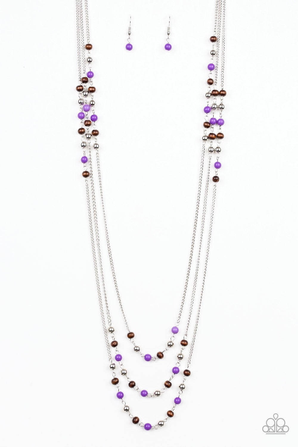 Seasonal Sensation - Purple - and Silver Stone Bead Wooden Bead Tiered Paparazzi Long Necklace