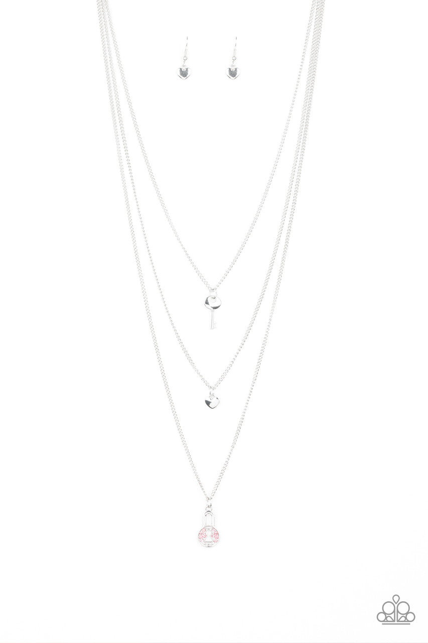 A shimmery silver key, heart, and pink rhinestone encrusted padlock trickle from the bottoms of glistening silver chains down the chest, creating whimsical layers. Features an adjustable clasp closure.