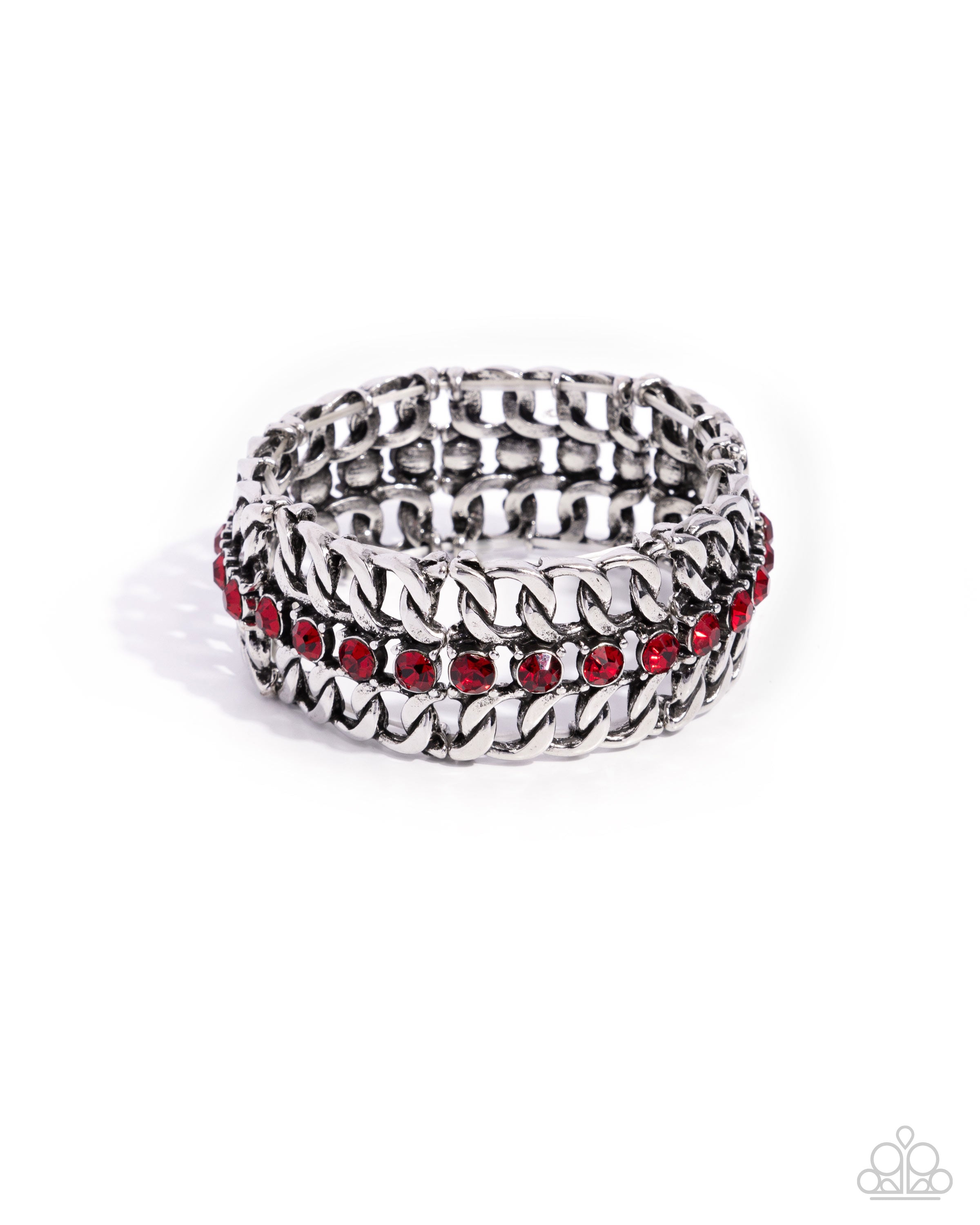 Infused between two glistening silver curb chains, a collection of faceted red gems in silver fittings glisten along the center of the wrist on elastic stretchy bands for a grungy, industrial look.