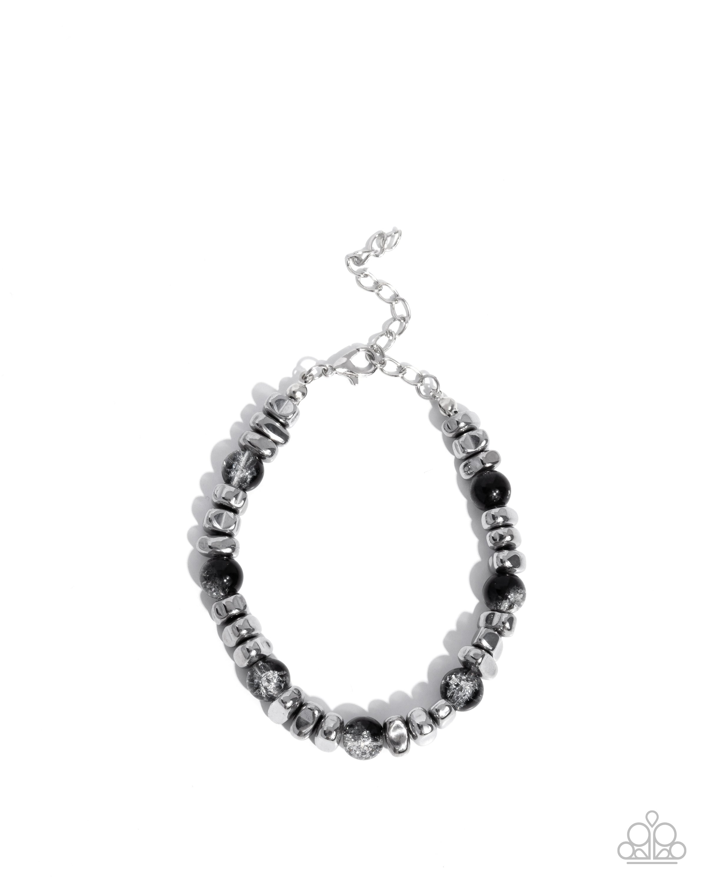 Infused along an invisible string, a collection of chiseled silver pebbles alternates with bubble-encased smoky round beads that sporadically shimmer along the wrist for an urban pop of color. Features an adjustable clasp closure.