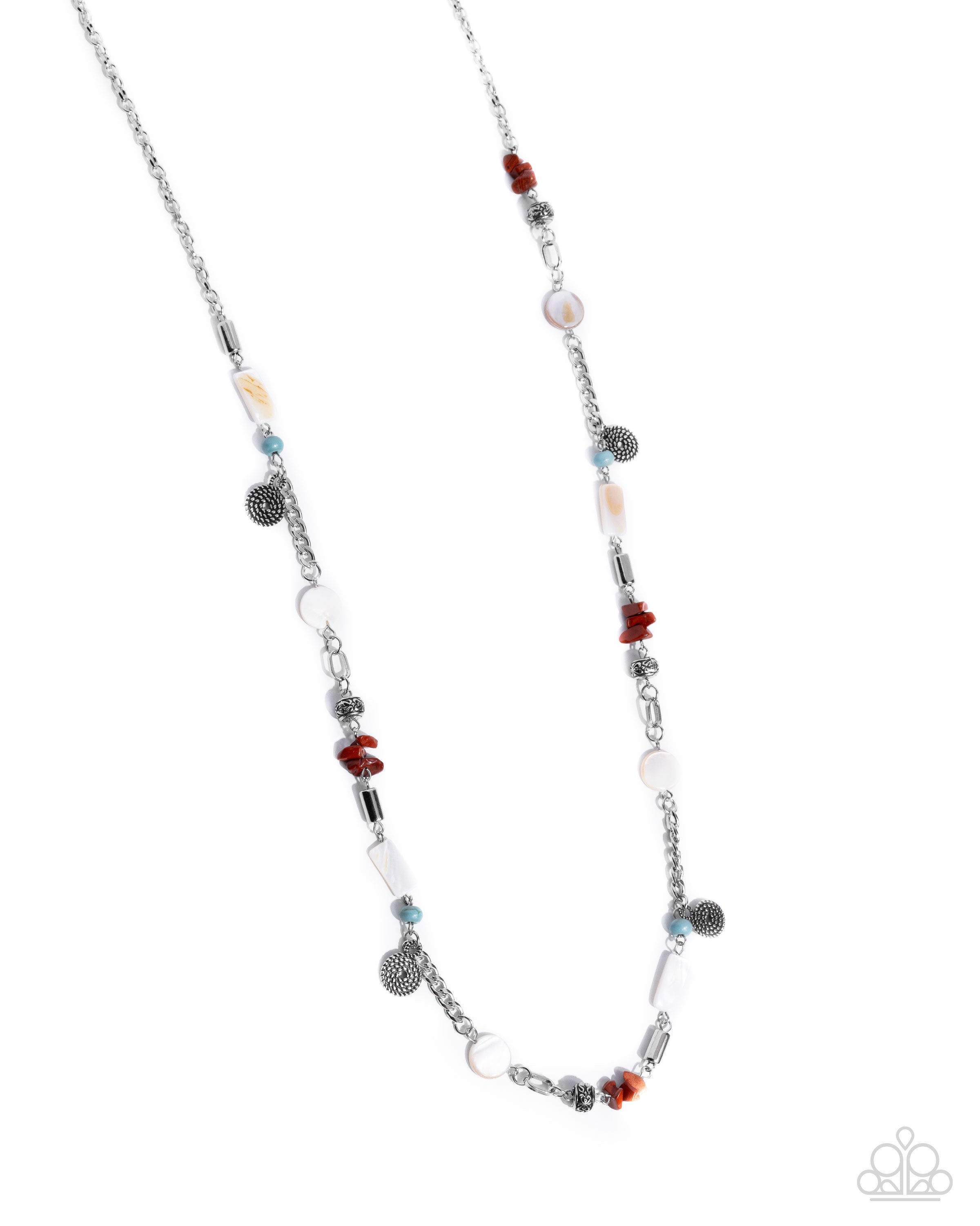 Infused along an extended, dainty silver curb chain, a collection of eclectic materials including cylindrical silver beads, coil-textured pendants, white shells in varying cuts, turquoise stone beads, ornamental silver beads, and chiseled red stones coalesce and pattern below the neckline for an opulent, one-of-a-kind look. Features an adjustable clasp closure. As the stone elements in this piece are natural, some color variation is normal.