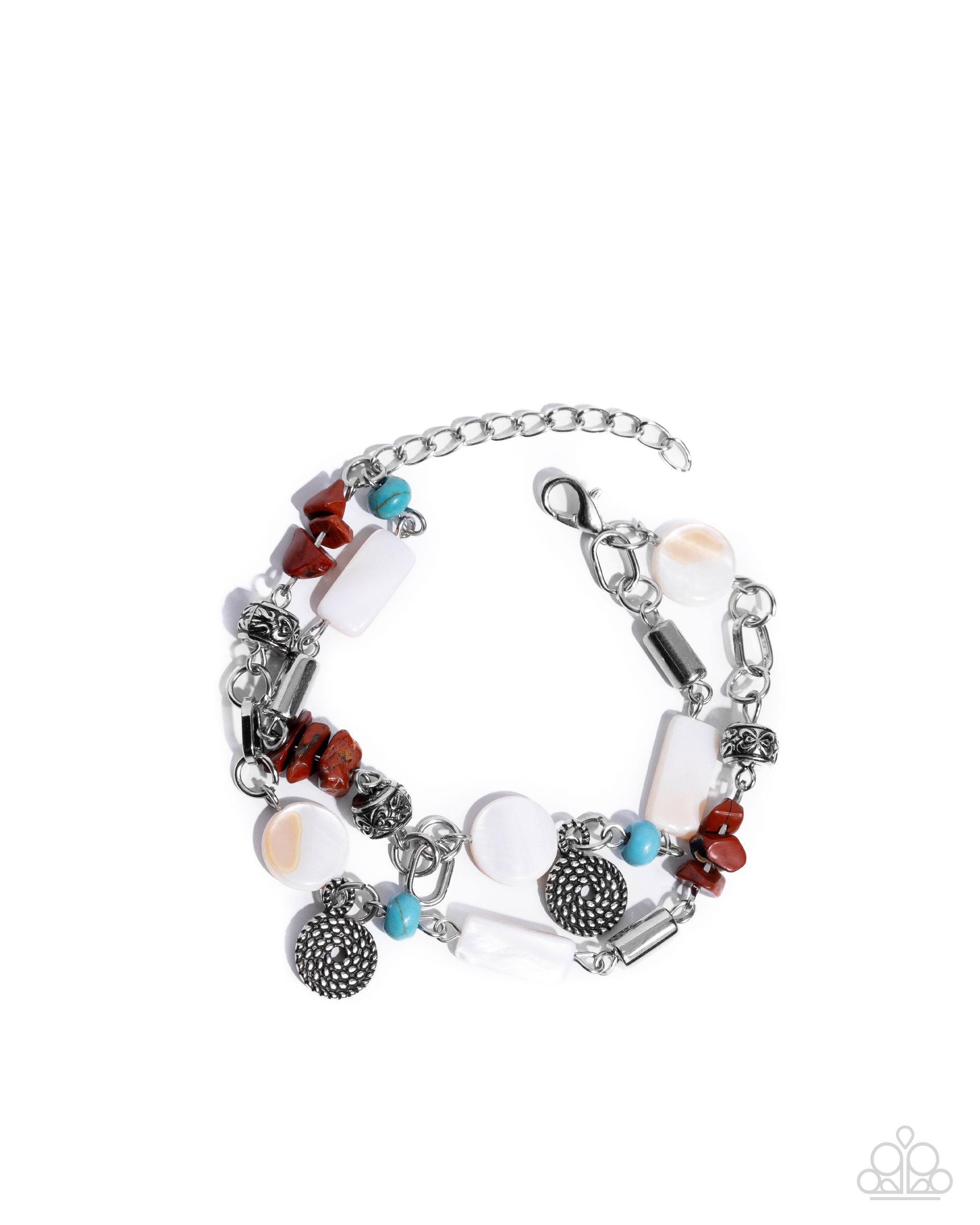 Infused along layered, abstract silver chains, a collection of eclectic materials including cylindrical silver beads, coil-textured pendants, white shells in varying cuts, turquoise stone beads, ornamental silver beads, and chiseled red stones coalesce and pattern around the wrist for an opulent, one-of-a-kind look. Features an adjustable clasp closure. As the stone elements in this piece are natural, some color variation is normal.