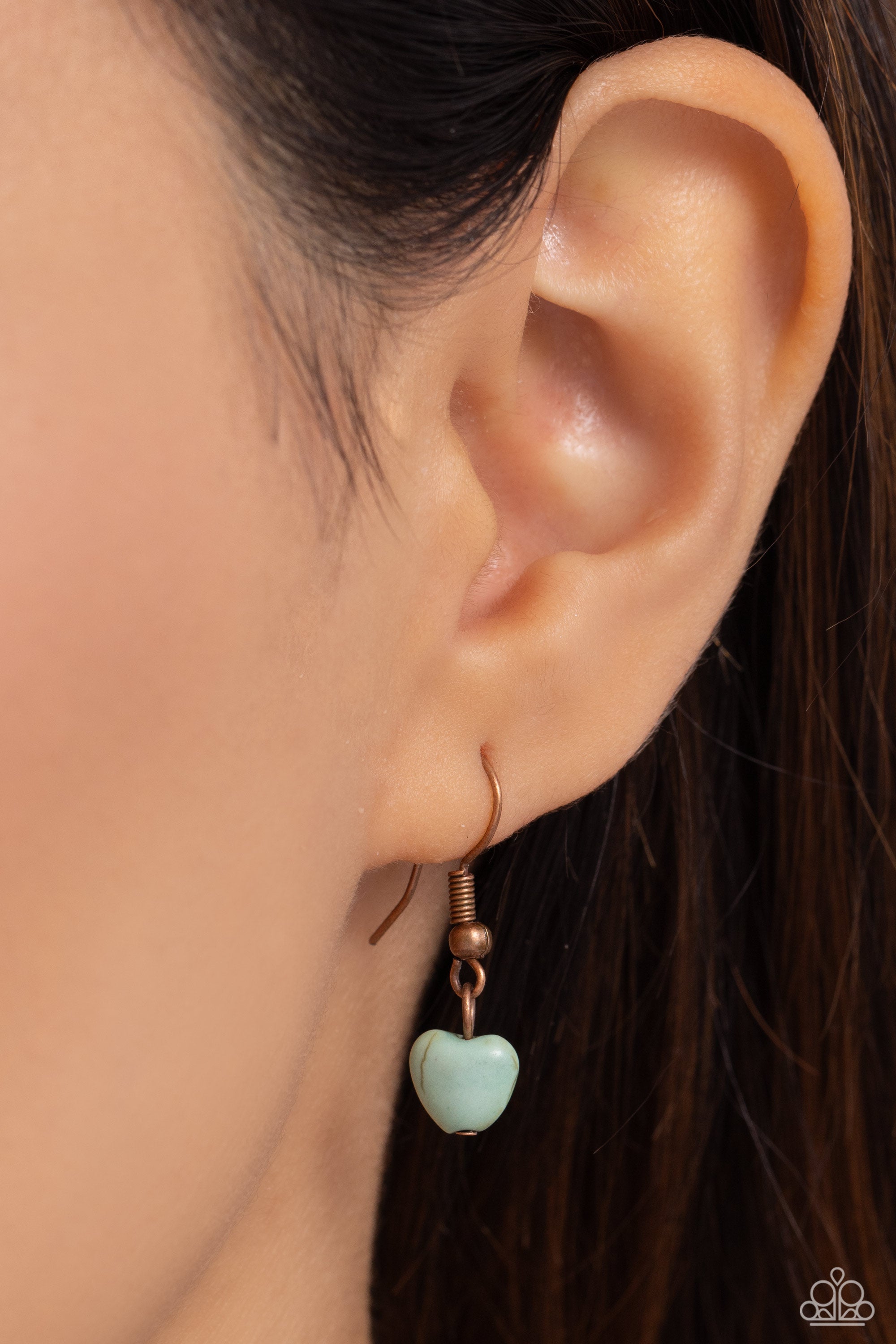 Pressed in copper fittings, light blue stone hearts delicately link below the collar, creating an earthy vintage-inspired display. Features an adjustable clasp closure. As the stone elements in this piece are natural, some color variation is normal.