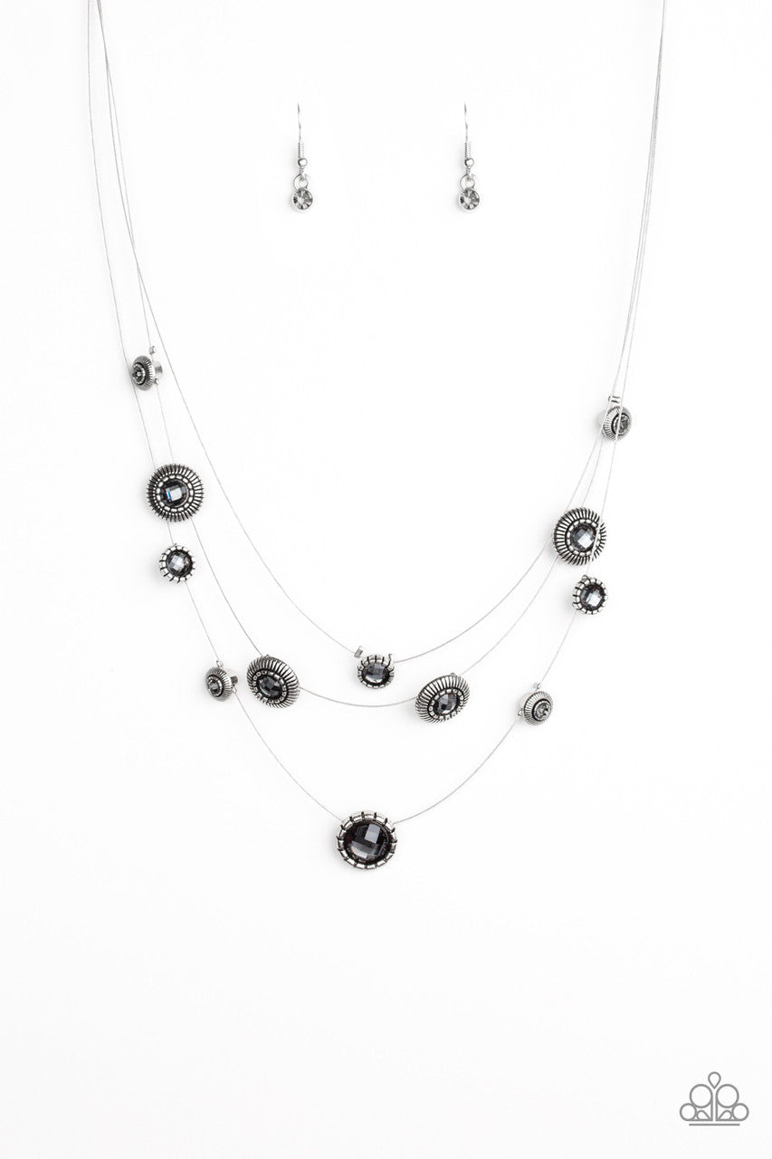 Dotted with smoky rhinestone centers, an array of ornate silver frames trickle along skinny silver wires below the collar for a whimsical flair. Features an adjustable clasp closure.