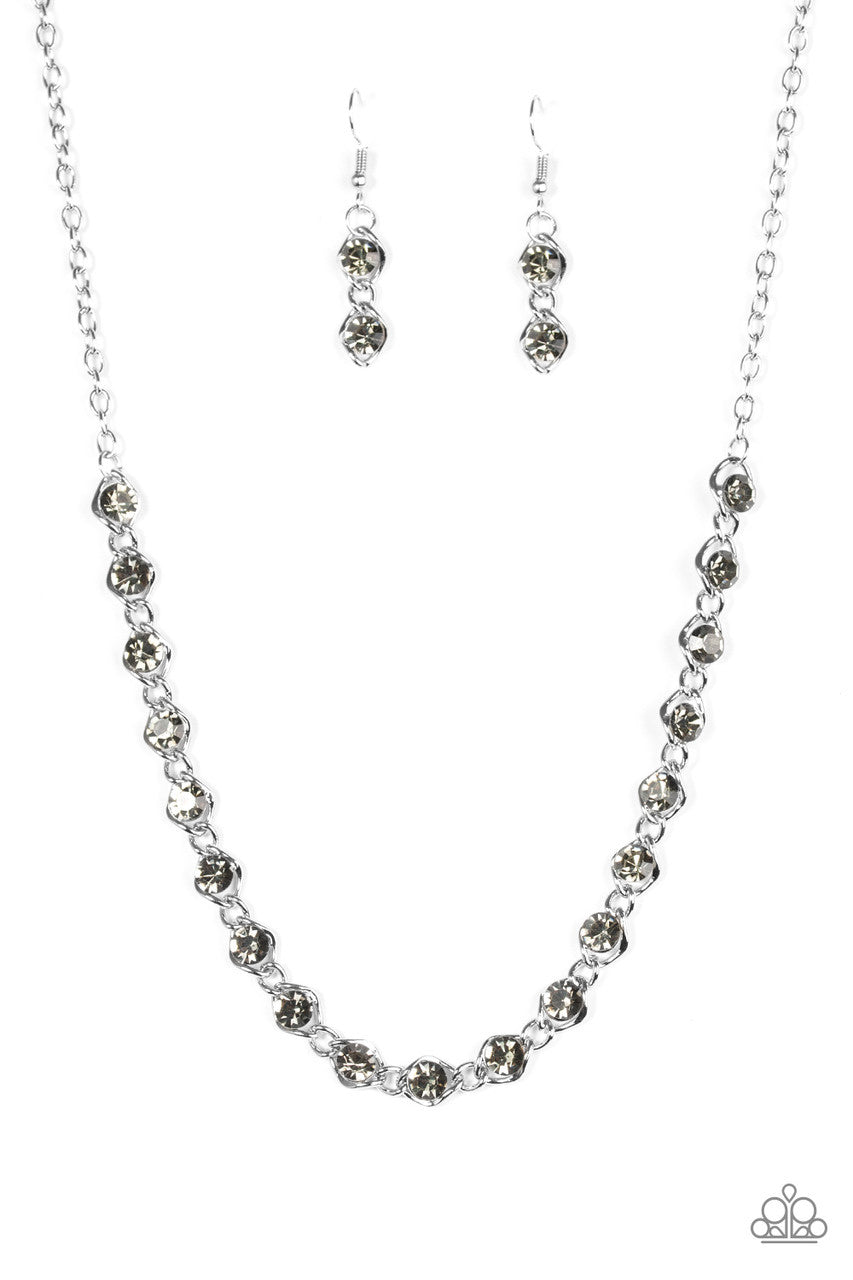Oversized smoky rhinestones are sprinkled along glistening silver chain, creating bold shimmer below the collar. Features an adjustable clasp closure.