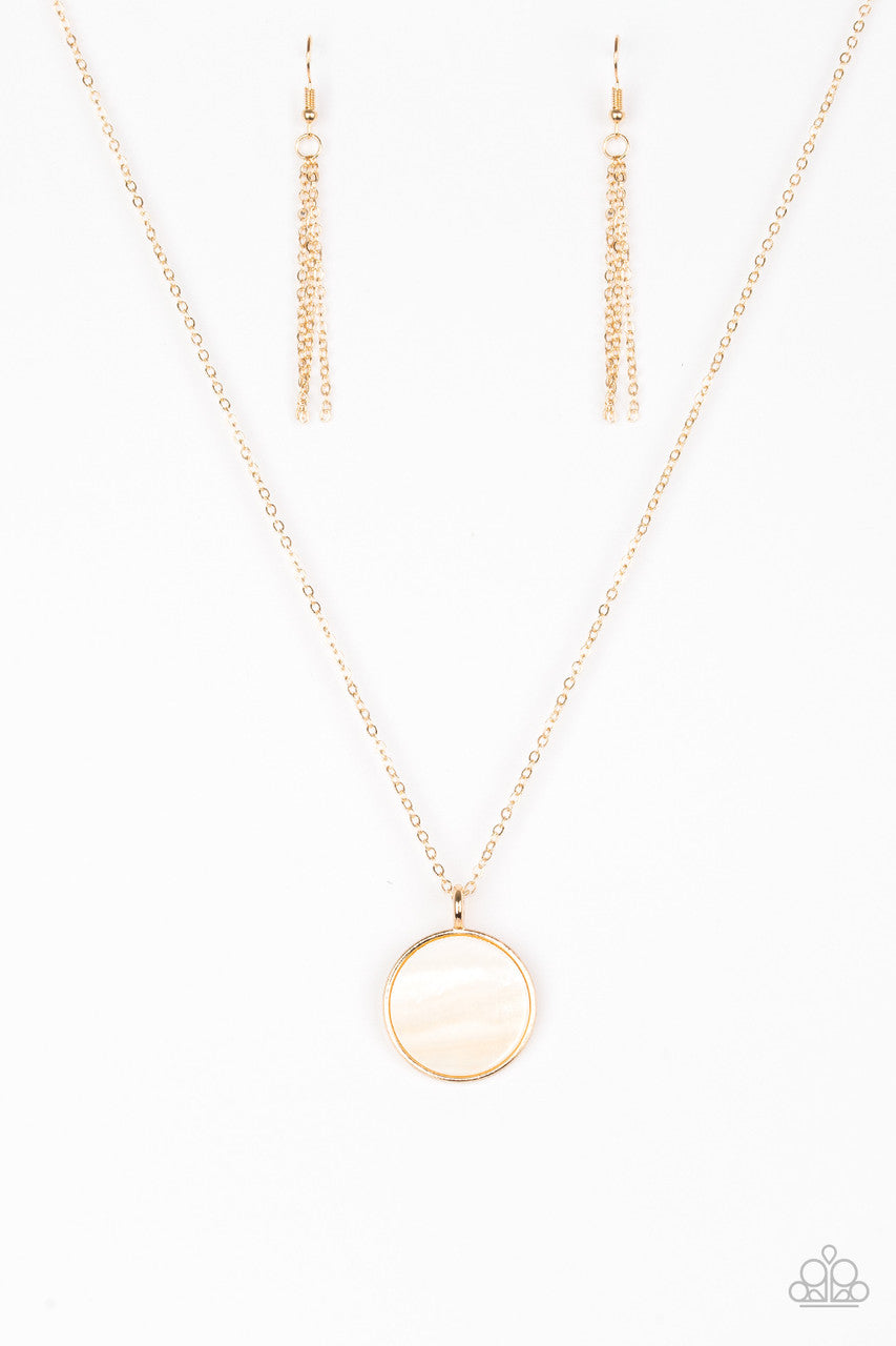 A flat shell-like pendant swings from the bottom of a dainty gold chain below the collar for a refined look. Features an adjustable clasp closure.