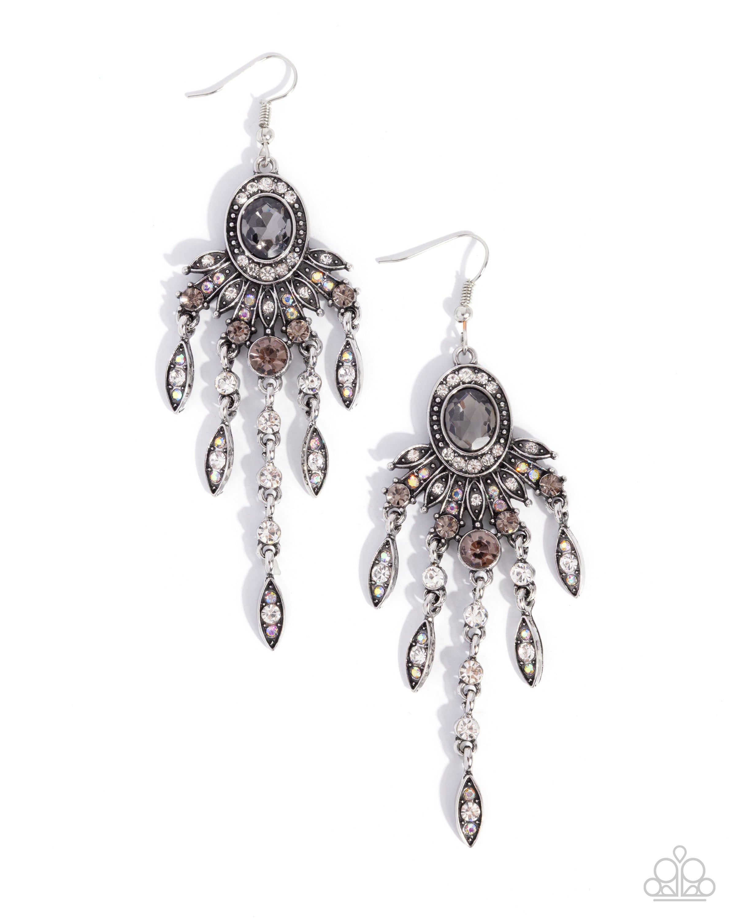 Pressed in a studded and white rhinestone-embellished silver oval frame, a faceted smoky oval gem stands out below the ear, giving way to marquise-cut fans dotted with white rhinestones and ribbons of smoky rhinestones in various sizes, solitaire white and iridescent rhinestones, and additional marquise-cut frames of glittery white and iridescent rhinestones, creating an elegant lure. Earring attaches to a standard fishhook fitting. Due to its prismatic palette, color may vary.