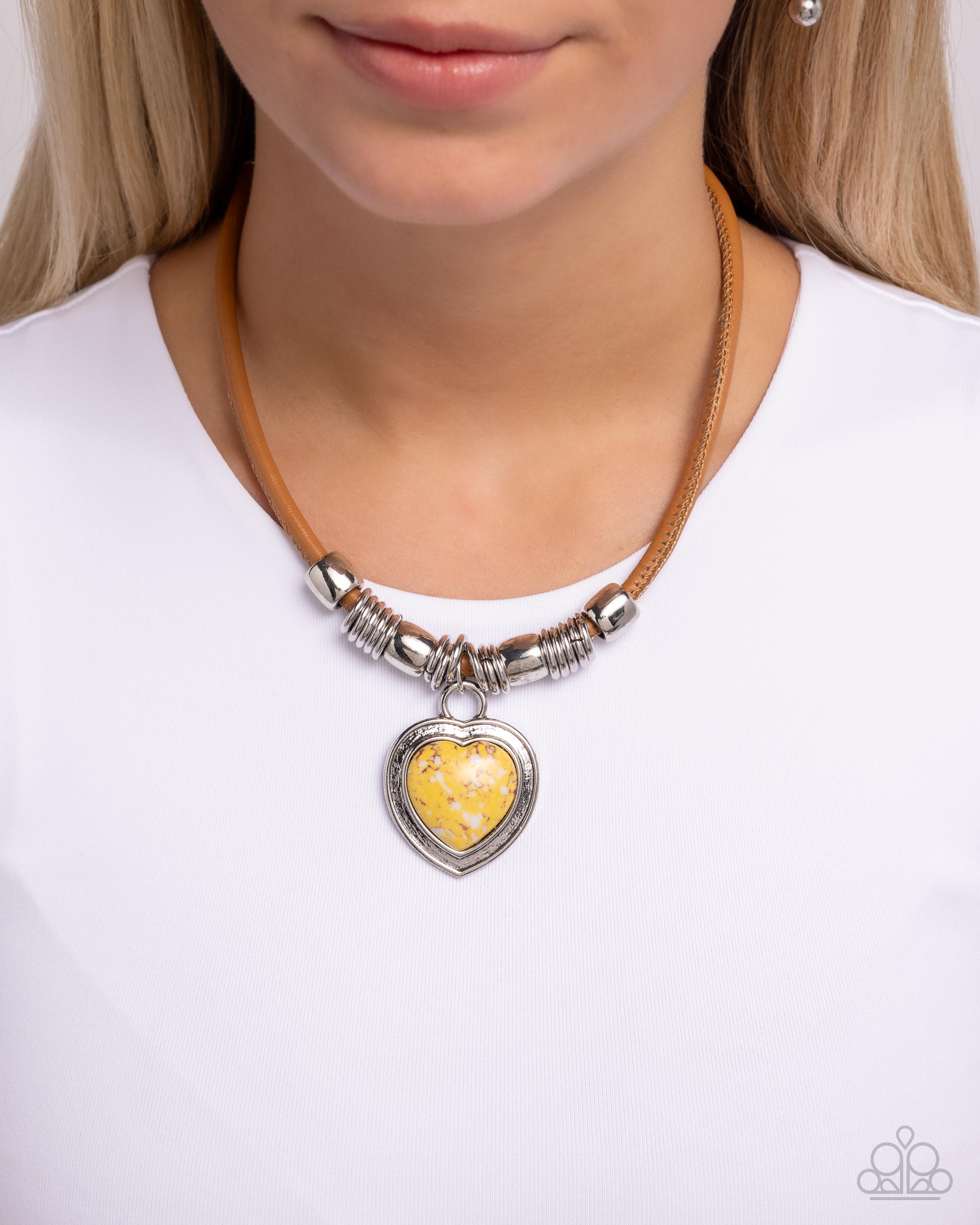 A yellow heart-shaped stone is encased in an antiqued silver frame and swings from a tan leather cord. Antiqued silver beads and rings slide along the leather cord adding a rustic metallic contrast. Features an adjustable clasp closure.