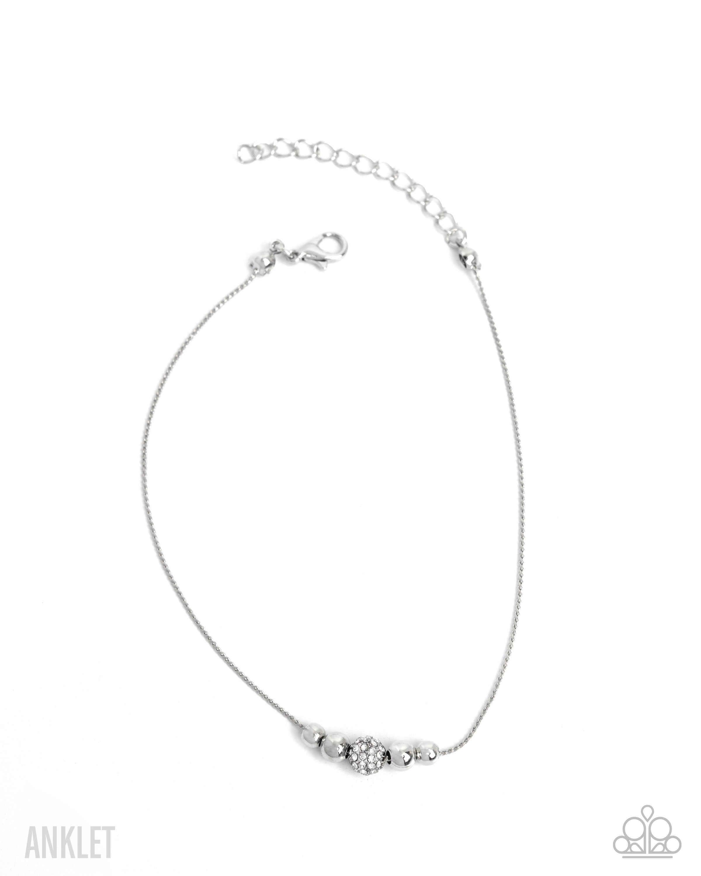 A delicate silver chain features a central accent composed of smooth silver beads and a shimmering, rhinestone-encrusted bead for added elegance. The minimalistic yet glamorous design adds a touch of sparkle to any look. Features an adjustable clasp closure.