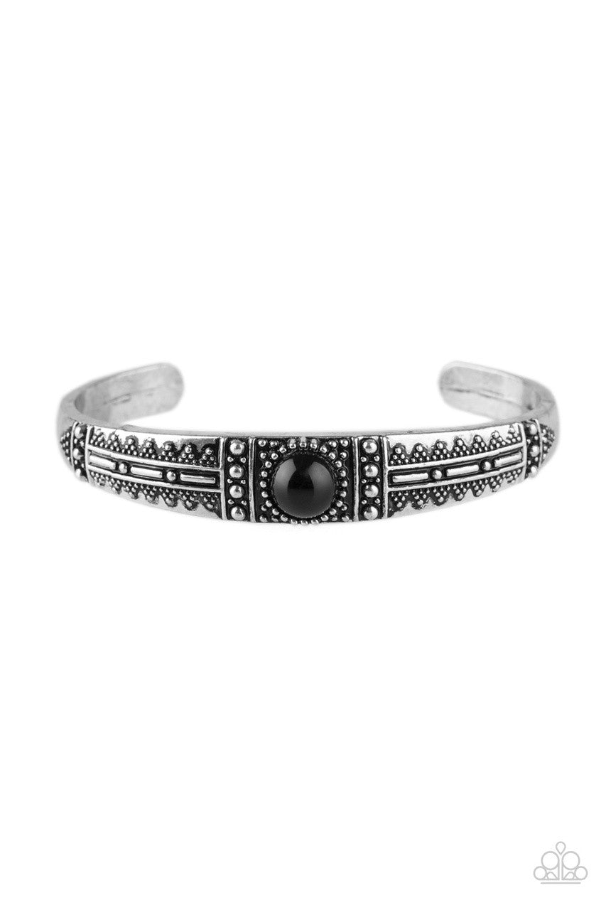 Dotted in geometric patterns, a dainty silver cuff curls around the wrist in a tribal inspired fashion. A refreshing black bead adorns the center of the cuff, adding a colorful finish to the indigenous piece.