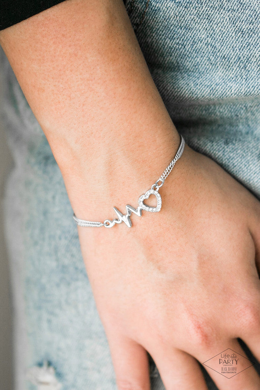 Reminiscent of a heartbeat, a wavy silver bar attaches to a charming heart silhouette for a simply beautiful display. Dazzling white rhinestones are sprinkled along the heart charm for a sparkling finish. Features an adjustable clasp closure.