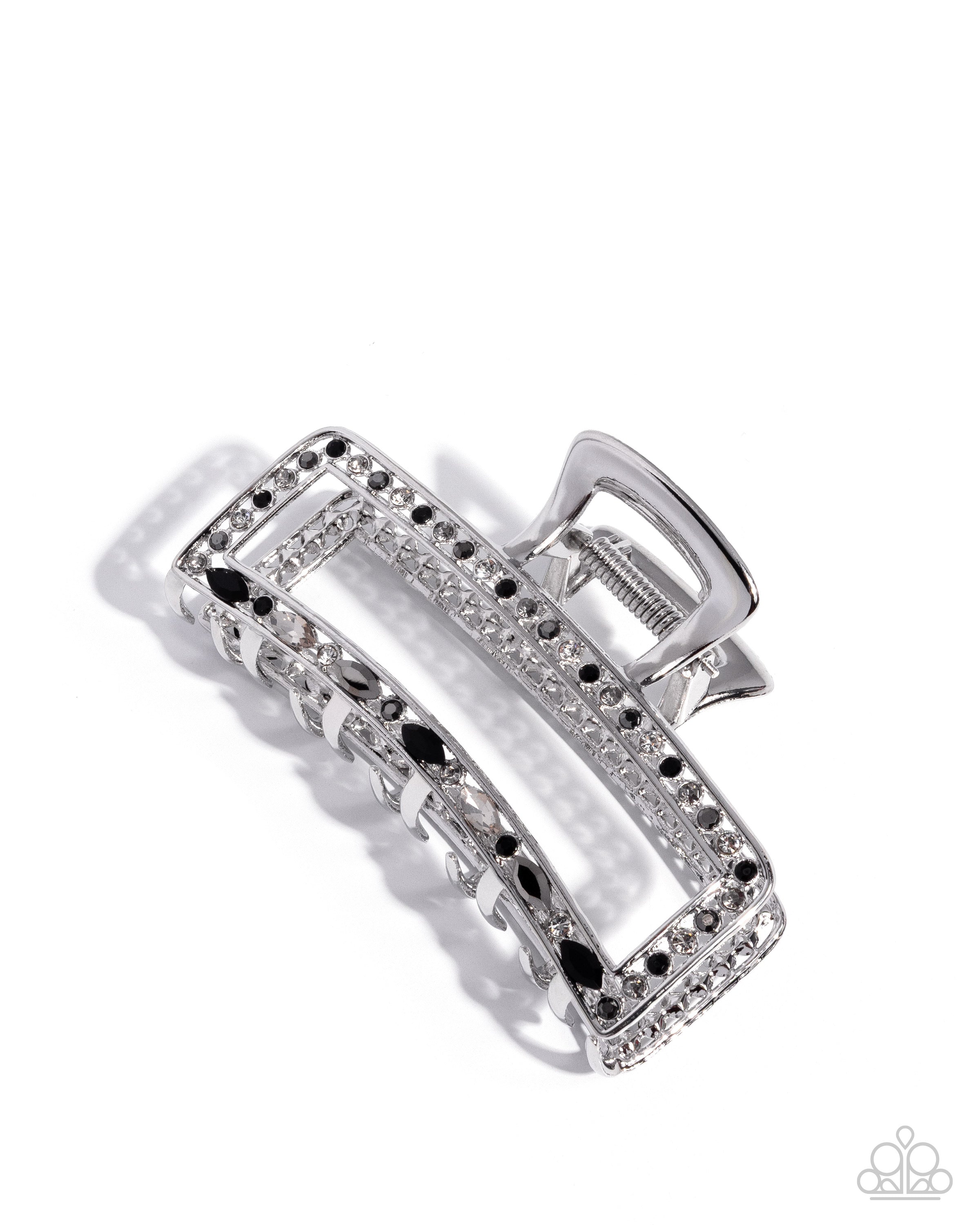 Dotted in black, hematite, white, and smoky rhinestone and gem detailing, an airy silver claw clip holds the hair away from the face for an on-the-go shimmery display. Clip measures approximately 2" in length and 3 3/4" in width.