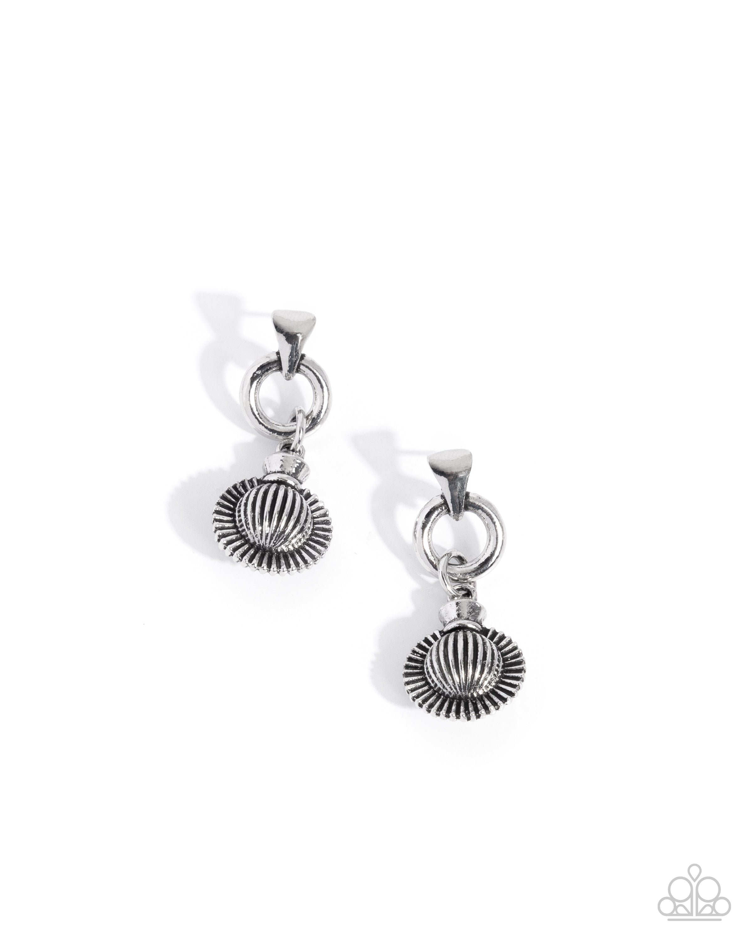 Brushed in a glistening shimmer, a silver hoop swings from the bottom of a triangular silver fitting, while a highly textured, sunburst-inspired pendant sways from the simple silver hoop for a handcrafted flair. Earring attaches to a standard post fitting.