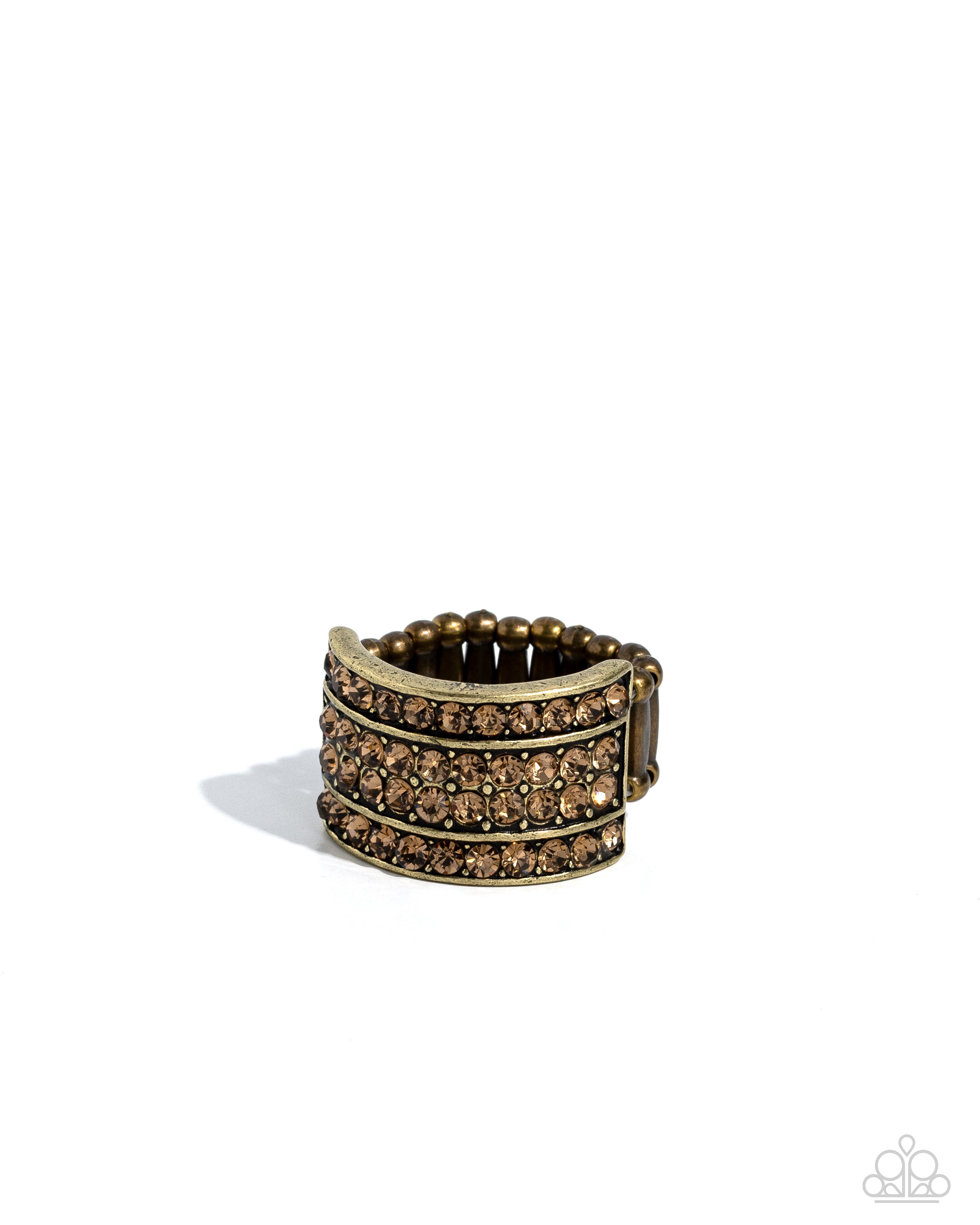 Two rows of glistening aurum gems stack into an incandescent brass square display. An additional double row of sparkling aurum rhinestones stack across the centermost band for an extra splash of colorful shimmer. Features a stretchy band for a flexible fit.