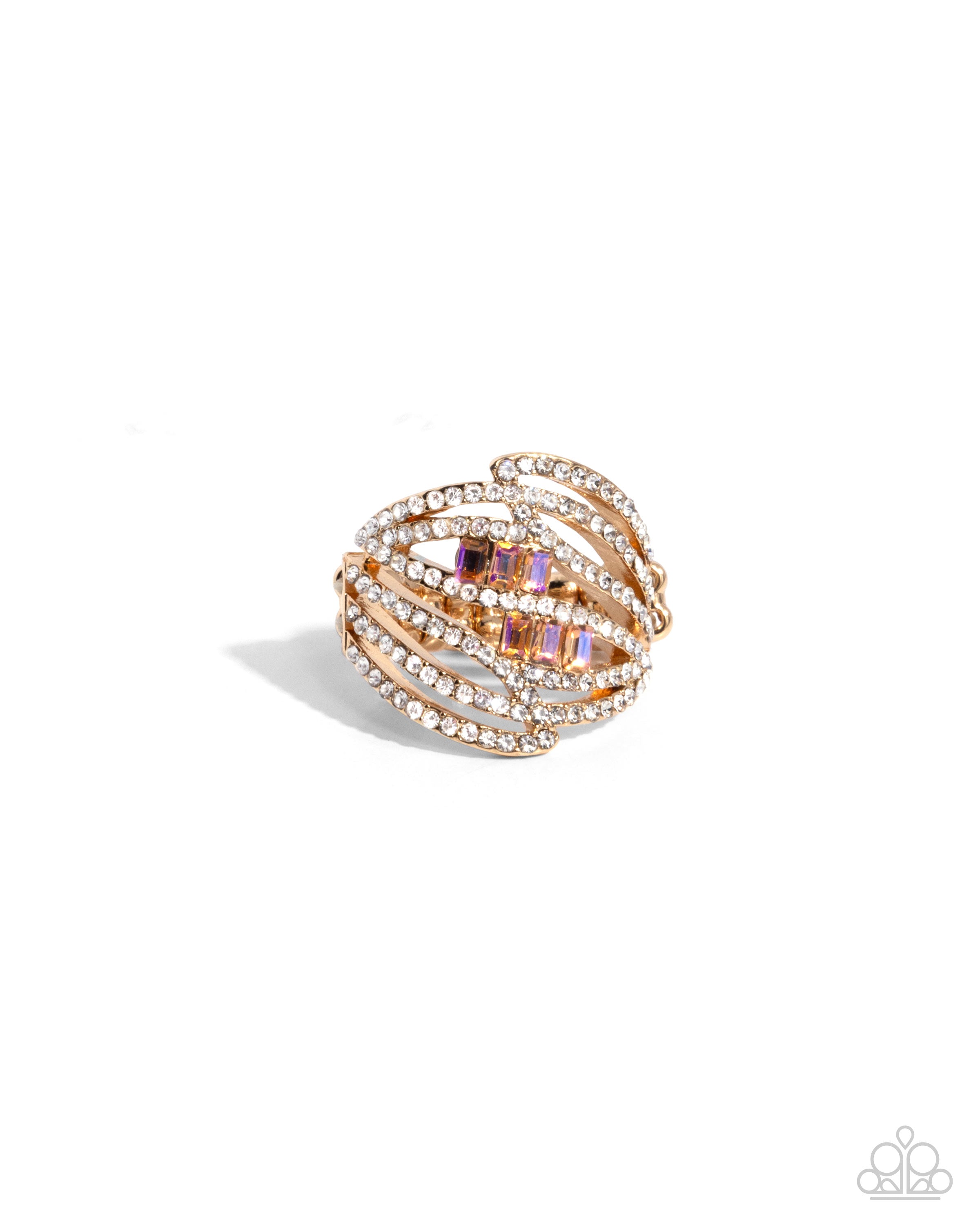 Dazzling rows of white rhinestones arc across the finger, creating a brilliant, layered effect. Set along the center of the ring, radiant rectangular orange-iridescent gems add a vibrant touch to the gold backdrop. Features a stretchy band for a flexible fit.