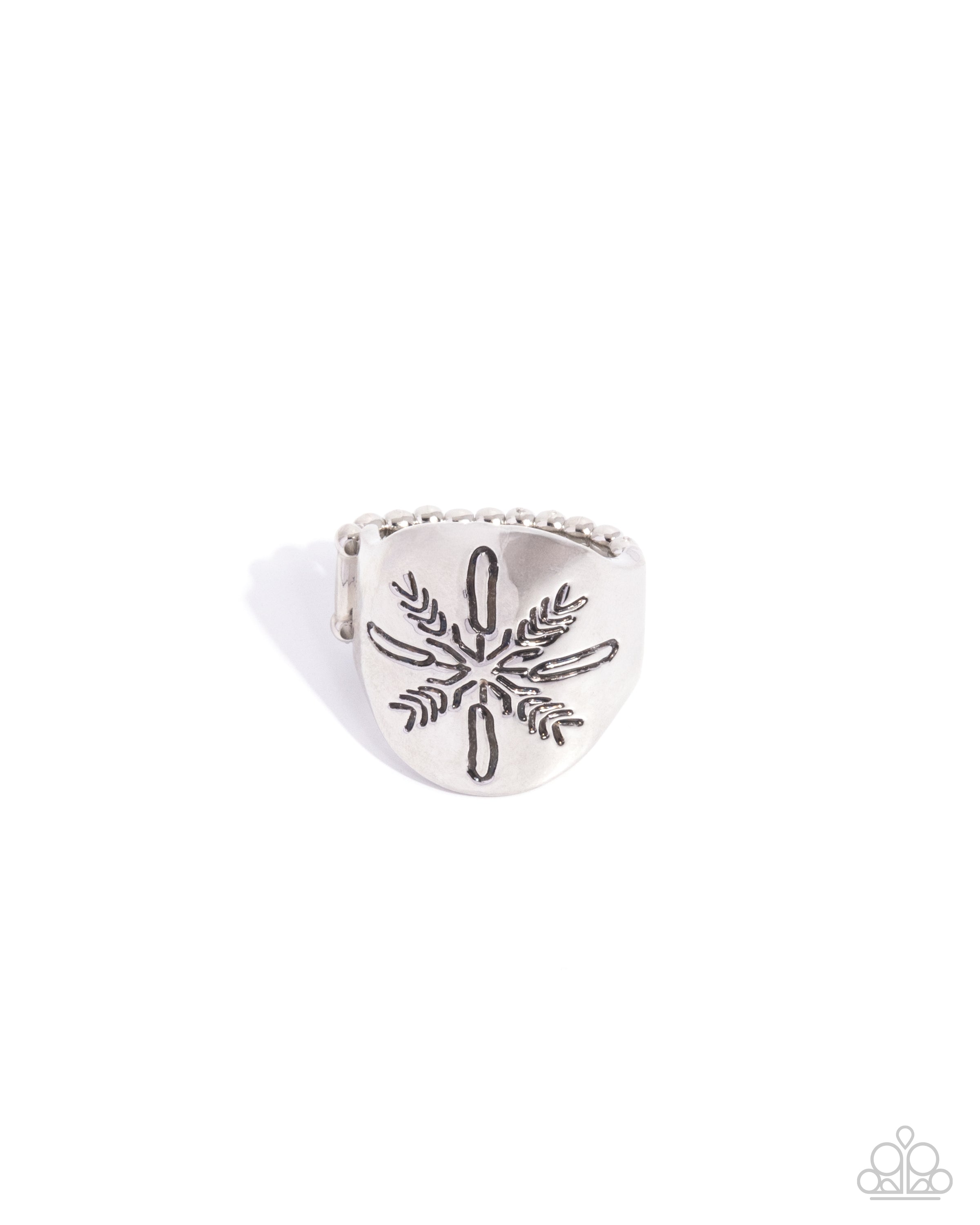 Embossed with an intricately textured snowflake, a classic silver ring stands out atop the finger for a winter wonderland-inspired look. Features a stretchy band for a flexible fit.