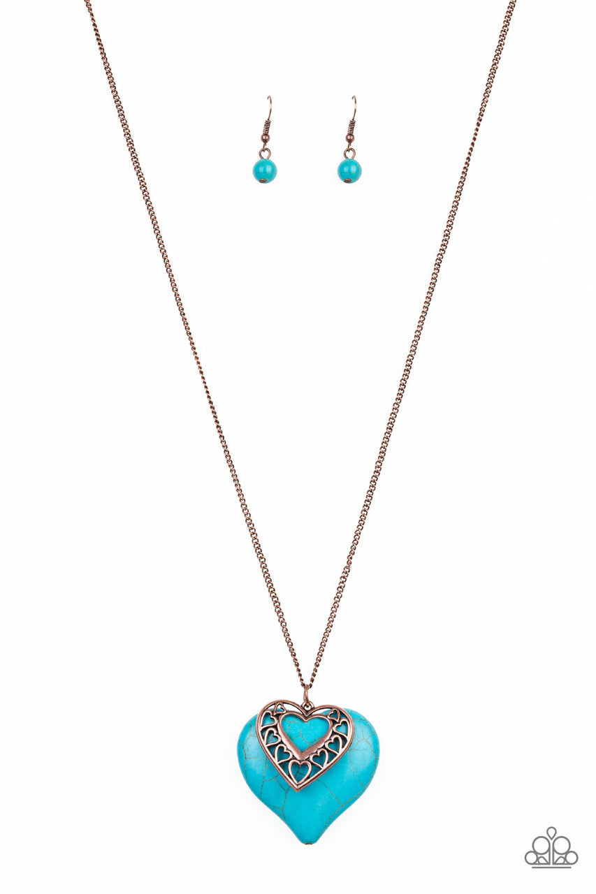 Chiseled into a flirtatious heart shape, a refreshing turquoise stone joins an ornate copper heart frame at the bottom of a lengthened copper chain for a whimsical look. Features an adjustable clasp closure.