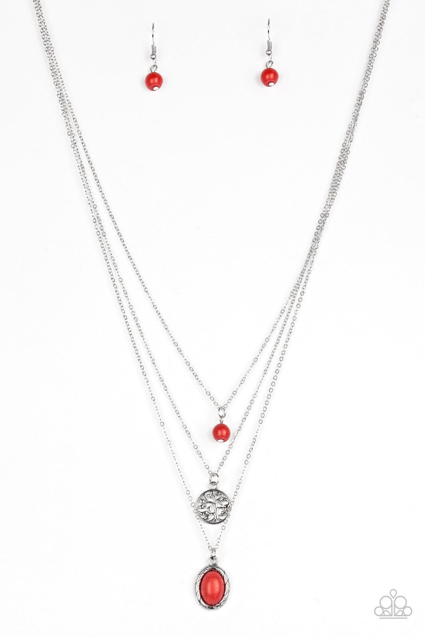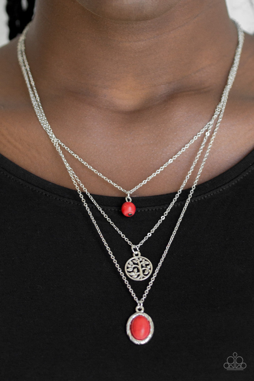 Three shimmery silver chains layer down the chest. A fiery red stone bead swings from the uppermost strand, above a radiant silver tree charm and an ornate red stone pendant for a seasonal look. Features an adjustable clasp closure.