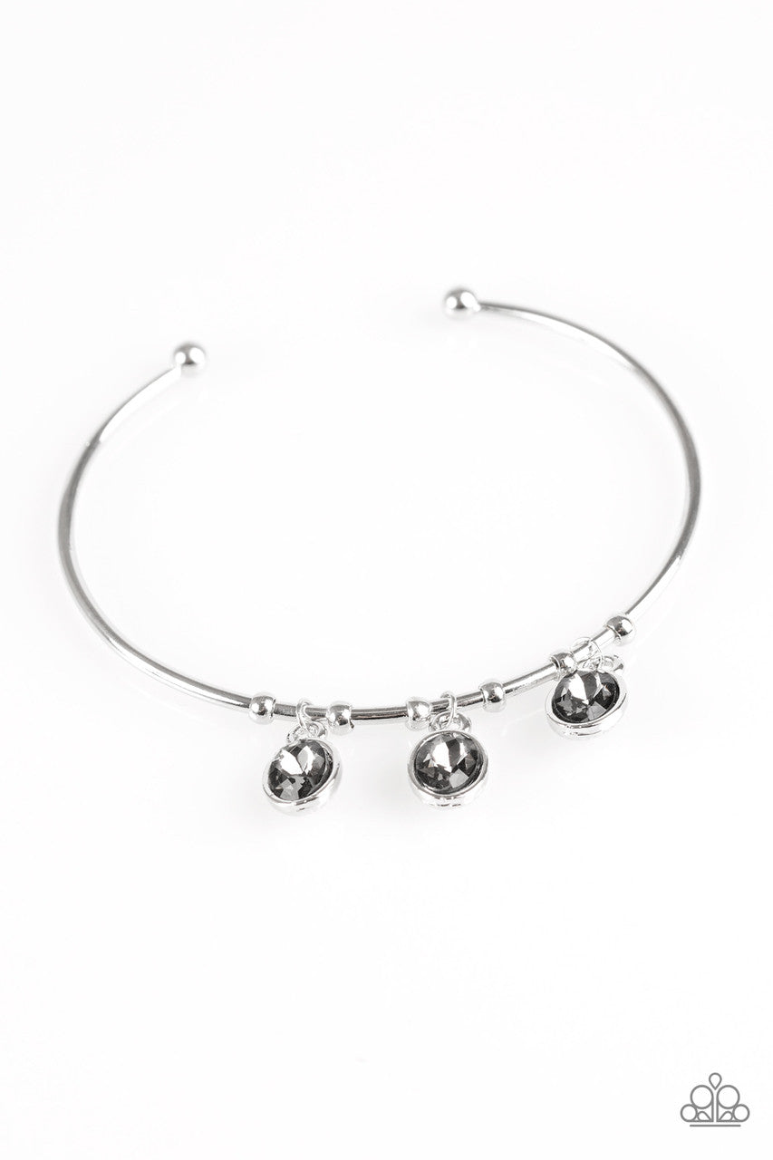 A skinny silver bar arcs across the wrist, creating a dainty cuff. Secured in place, smoky rhinestones swing from the wrist for a glamorous finish.