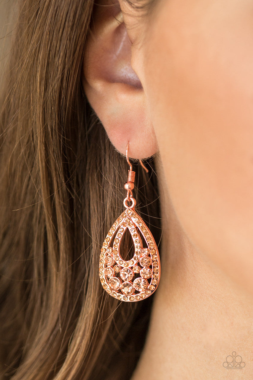 Encrusted in glassy peach rhinestones, shiny copper bars swoop into a glittery teardrop frame. Sparkling peach rhinestones are sprinkled across the airy frame for a refined finish. Earring attaches to a standard fishhook fitting.