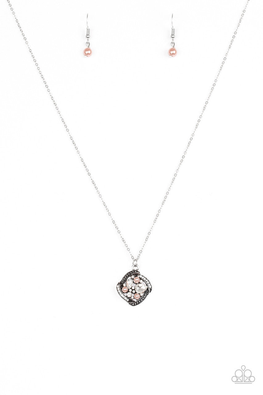 Alternating in silver studs and glassy white rhinestones, dainty silver bars fold around a sparkling mishmash of glassy white rhinestones and dainty brown pearls. The sparkling pendant swings below the collar for a timeless look. Features an adjustable clasp closure.