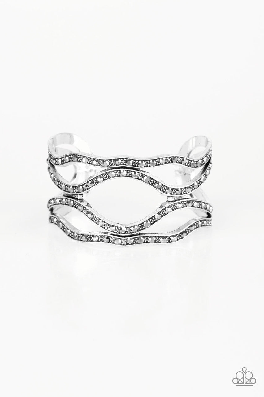 Encrusted in glittery hematite rhinestones, dotted silver bars wind across the wrist, coalescing into an edgy cuff.