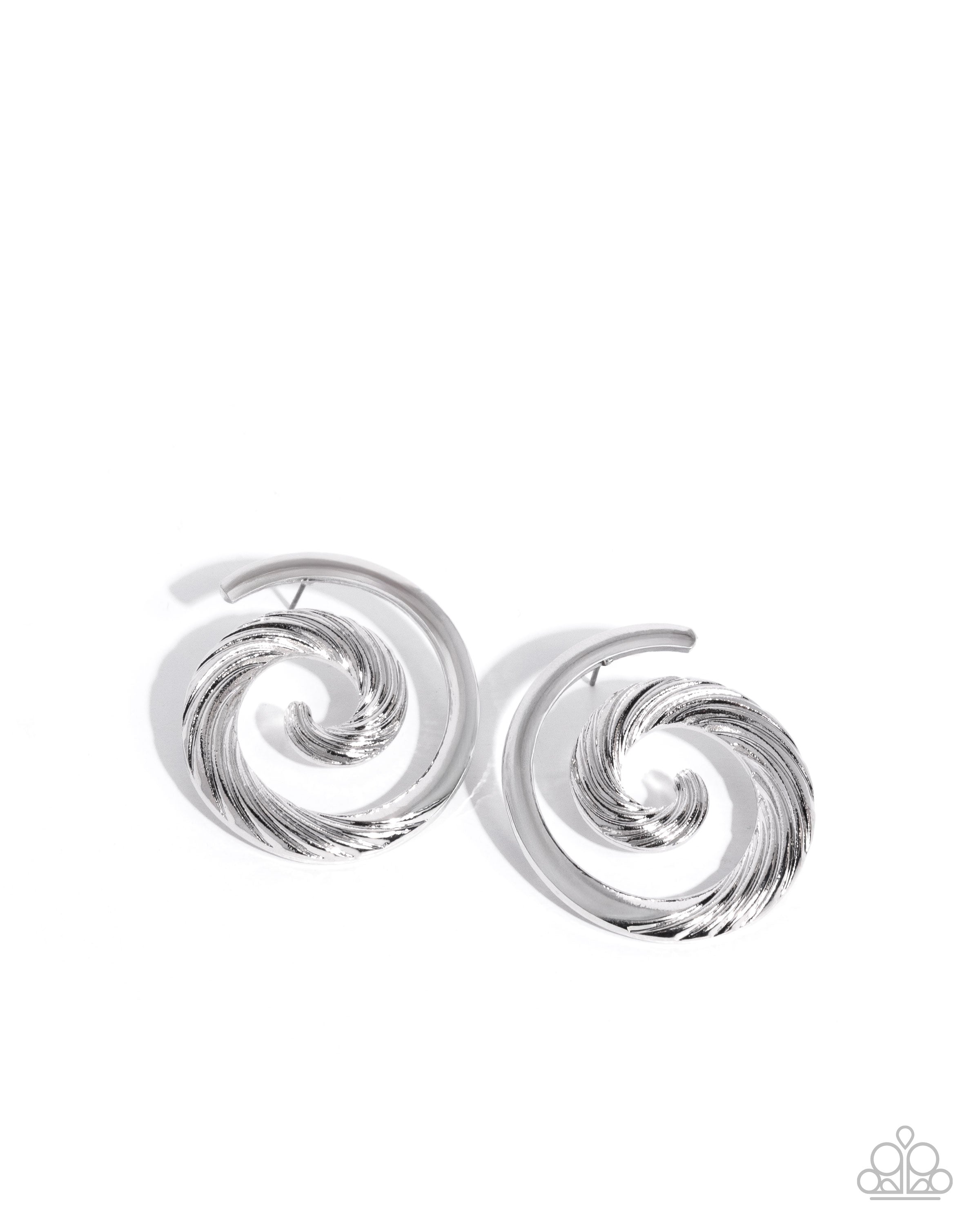 Shiny silver spirals create a bold circular silhouette, accentuated by a ridged texture that adds depth and dimension to the design. The slightly tapered ends of the spirals bring a dynamic and contemporary touch, while the high-shine finish enhances the edgy appeal. Earring attaches to a standard post fitting.