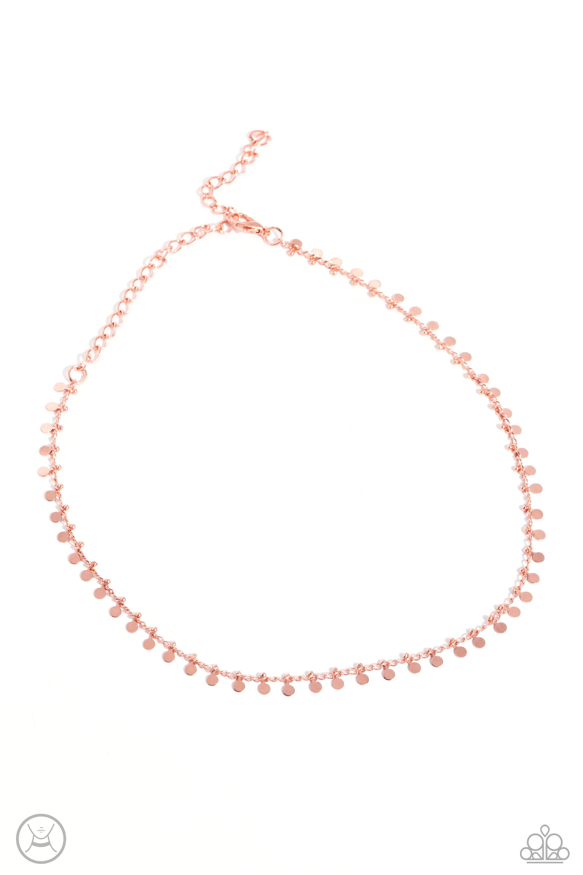 Featuring beaded fittings, a dainty collection of shiny copper discs glisten from the bottom of a dainty shiny copper chain around the neck for a minimalist inspired style. Features an adjustable clasp closure.