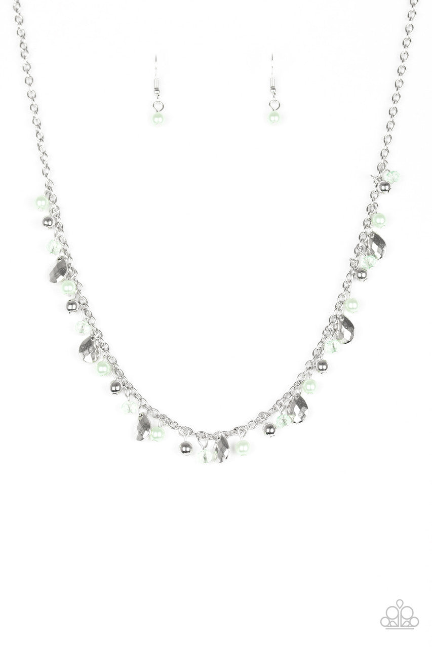 Pearly green and crystal-like beads trickle from a silver chain, creating a bubbly fringe below the collar. Faceted silver teardrops drip between the colorful beading, adding timeless shimmer to the seasonal look. Features an adjustable clasp closure.