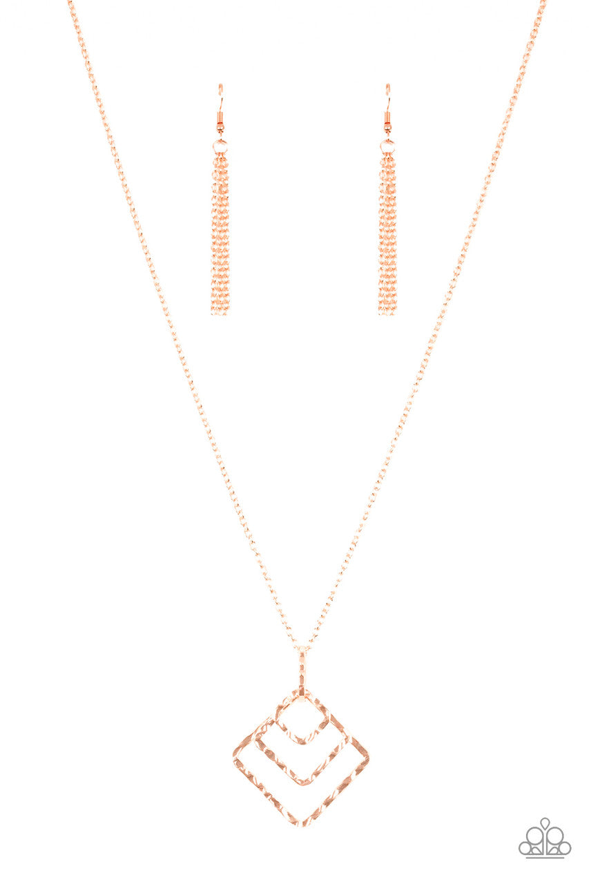 Varying in size, a trio of hammered shiny copper square frames swing from the bottom of a lengthened shiny copper chain, creating an edgy pendant. Features an adjustable clasp closure.