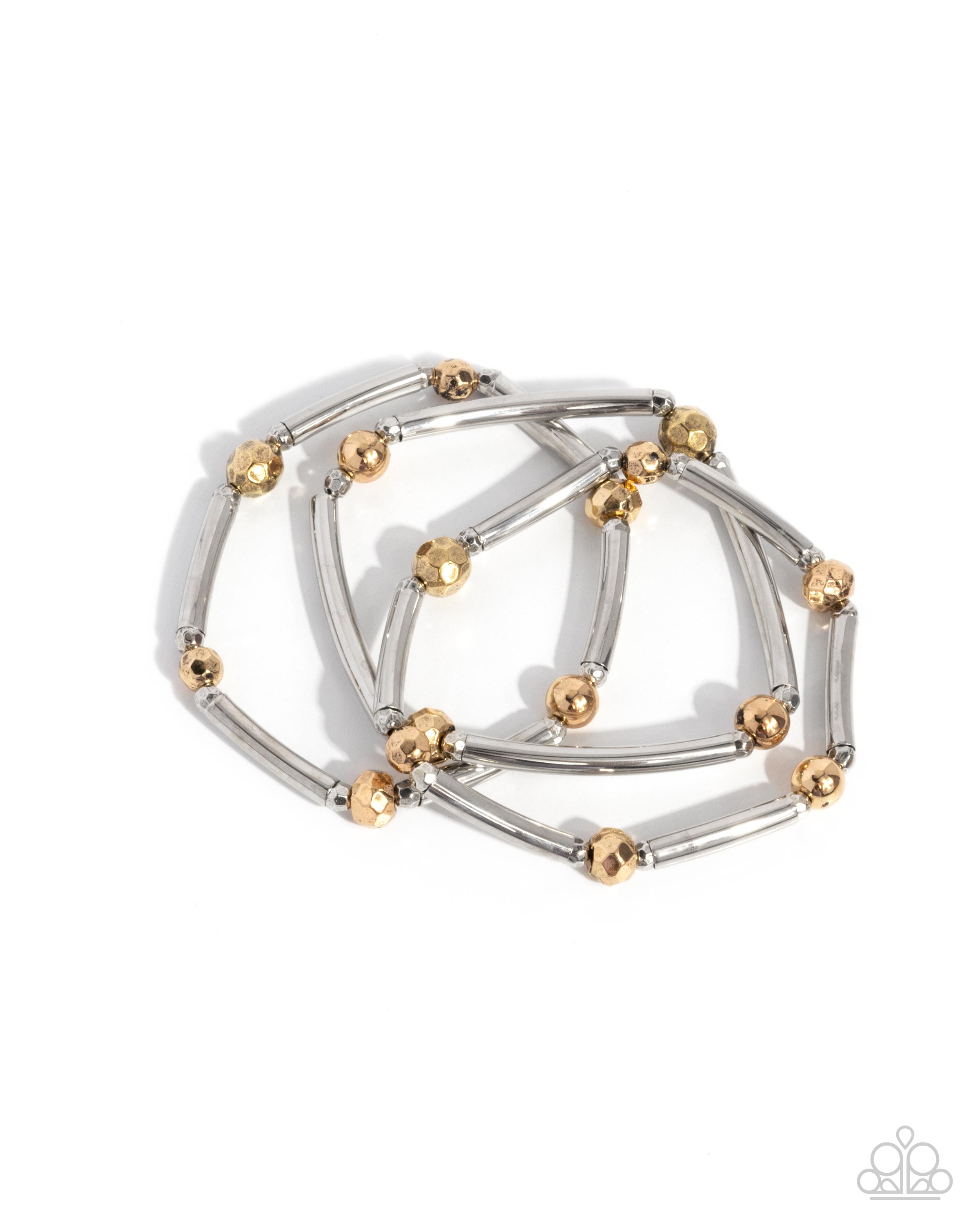 Infused along elastic stretchy bands, a collection of solid gold and faceted gold beads combine with silver faceted beads and silver cylindrical bars along the wrist for a sleek, stacked display.