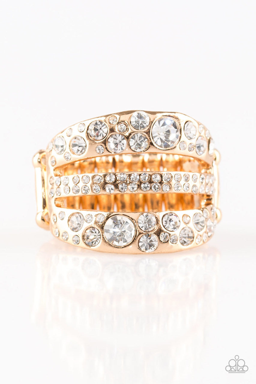 Varying in size, glassy white rhinestones are encrusted across three glistening gold bands, creating a sporadic shimmer. Features a stretchy band for a flexible fit.