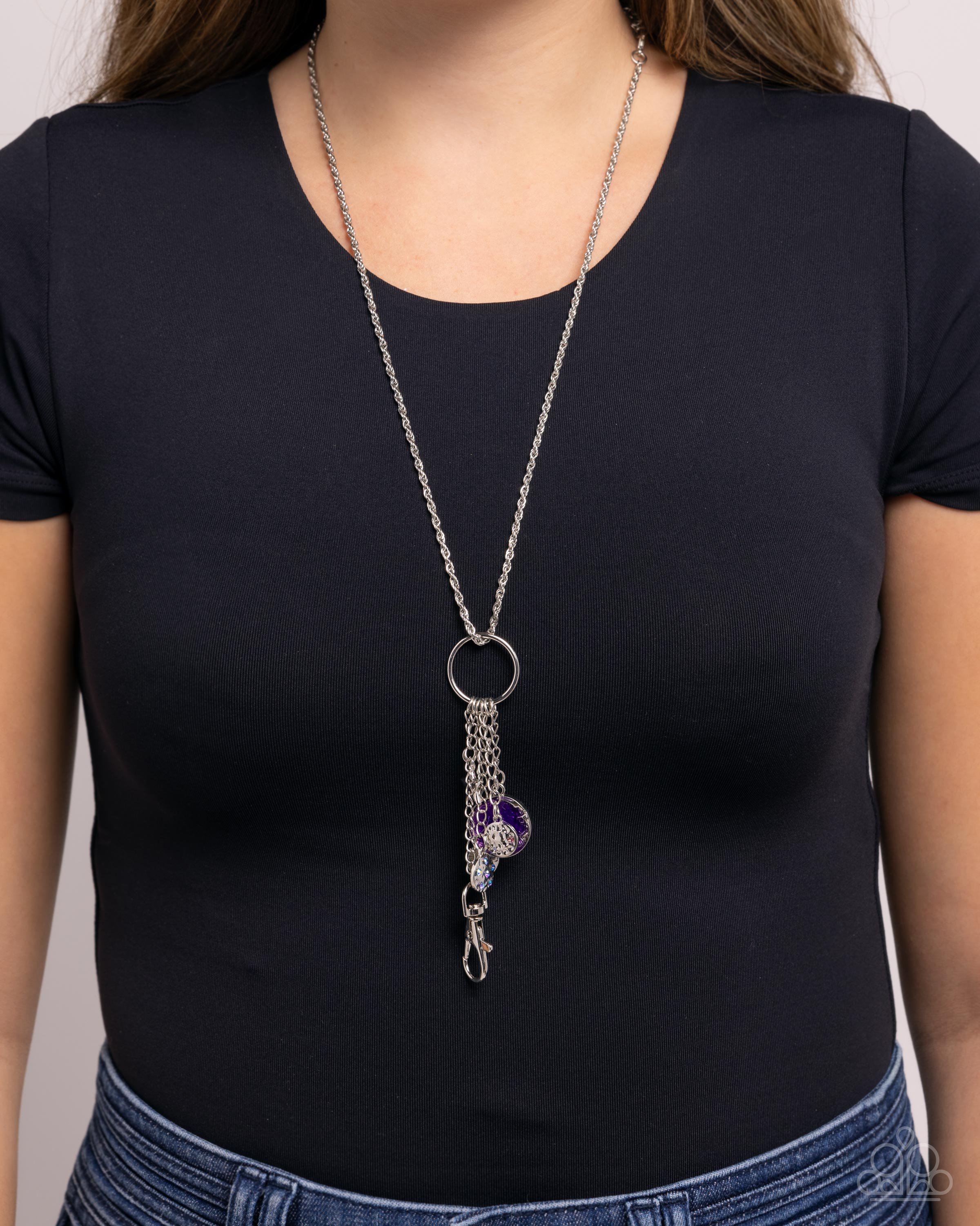 Accented with purple pearlized paint, a half-crescent moon and star-dotted disc join a collection of light rose, violet iridescent, and aquamarine rhinestone-dotted hammered silver discs and a solitaire silver star all cascading from the bottom of a silver ring on classic silver chains attached to a lengthened silver rope chain for a cosmically chic look. A silver lobster clasp hangs from the bottom of the design to allow a name badge or other item to be attached. Features an adjustable clasp closure. Due to its prismatic palette, color may vary.