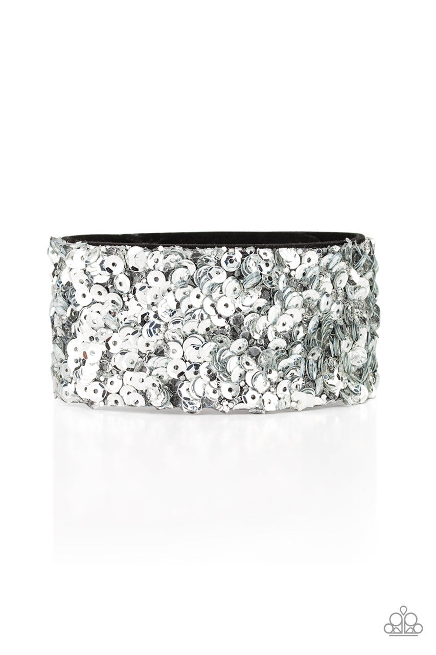 A collision of glittery rhinestones and sparkling silver sequins are encrusted along the front of a black suede band, creating blinding shimmer around the wrist. Features an adjustable snap closure.