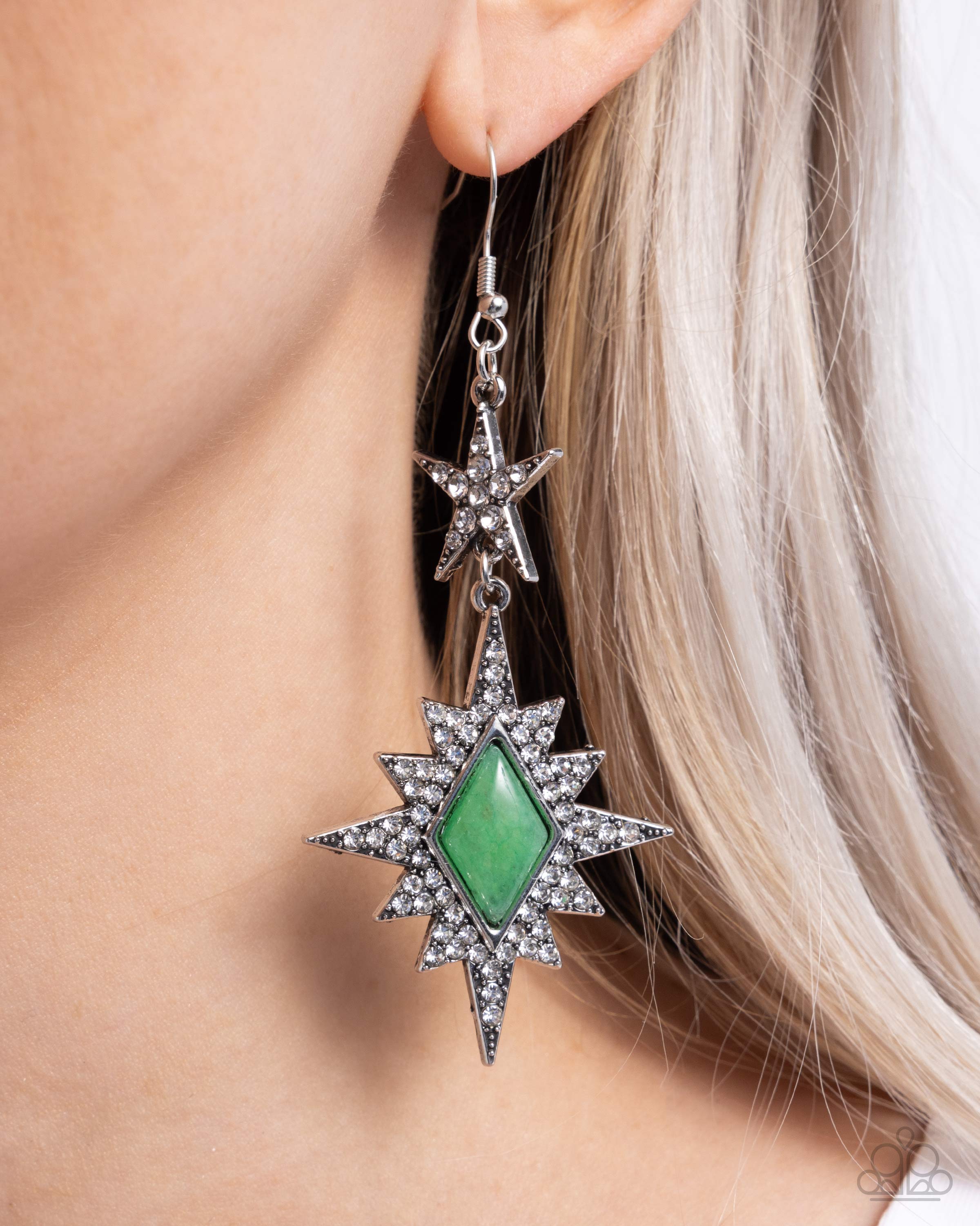 A white rhinestone-embellished star gives way to a Jade diamond shaped stone pressed in a larger white rhinestone-embellished three-dimensional star, infusing the design with eclectic, extraterrestrial movement. Earring attaches to a standard fishhook fitting. As the stone elements in this piece are natural, some color variation is normal.