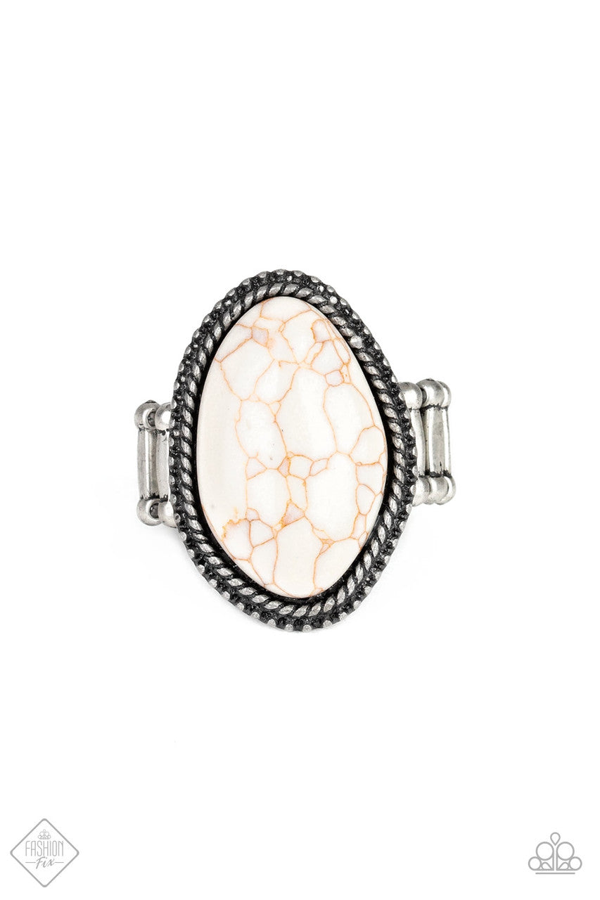 A refreshing a white stone is pressed into a studded tin finished frame with asymmetrical borders. Features a stretchy band for a flexible fit.