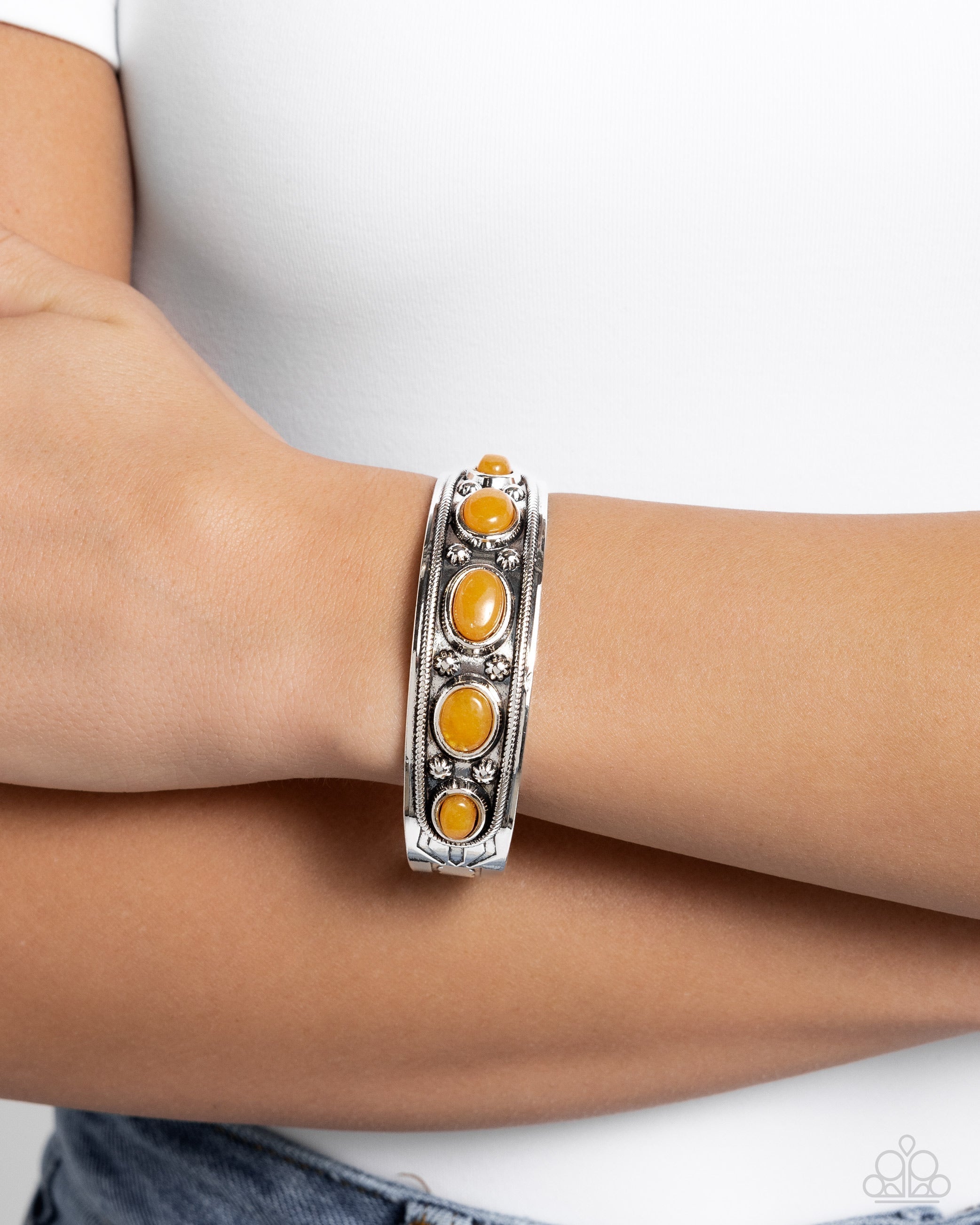 Set in oval silver frames, orange stone beads curl around the wrist atop a silver rope-textured and floral-embellished silver cuff for an artisan-inspired statement. As the stone elements in this piece are natural, some color variation is normal.