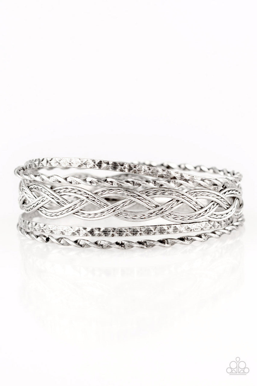 Featuring smooth and textured finishes, mismatched silver bangles glide along the wrist for a causal fashion.