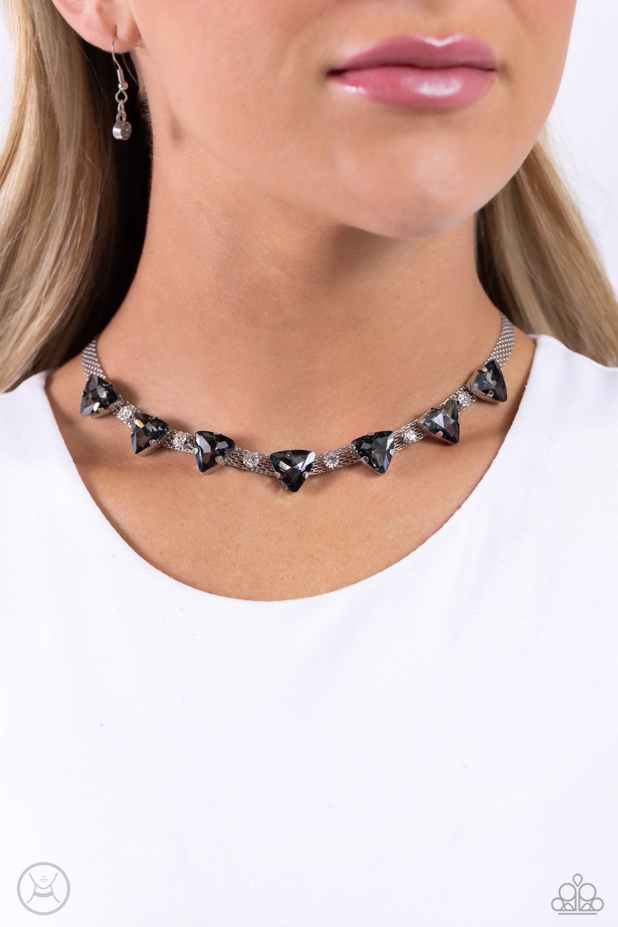 Suspended from two silver fittings, a shimmery cascade of dainty silver chains layer around the collar for an industrial statement. Infused amongst the industrial strands, a collection of pronged white gems alternate with pronged smoky triangular gems for a touch of gritty color. Features an adjustable clasp closure.