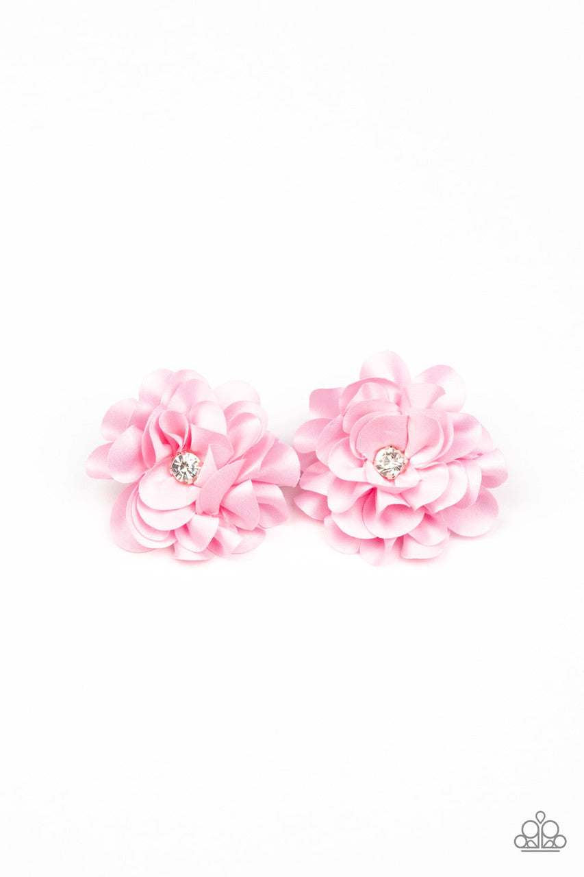 Soft pink chiffon petals gather around two white rhinestone centers, creating a refined pair of blossoms. Each flower features a standard hair clip on the back.