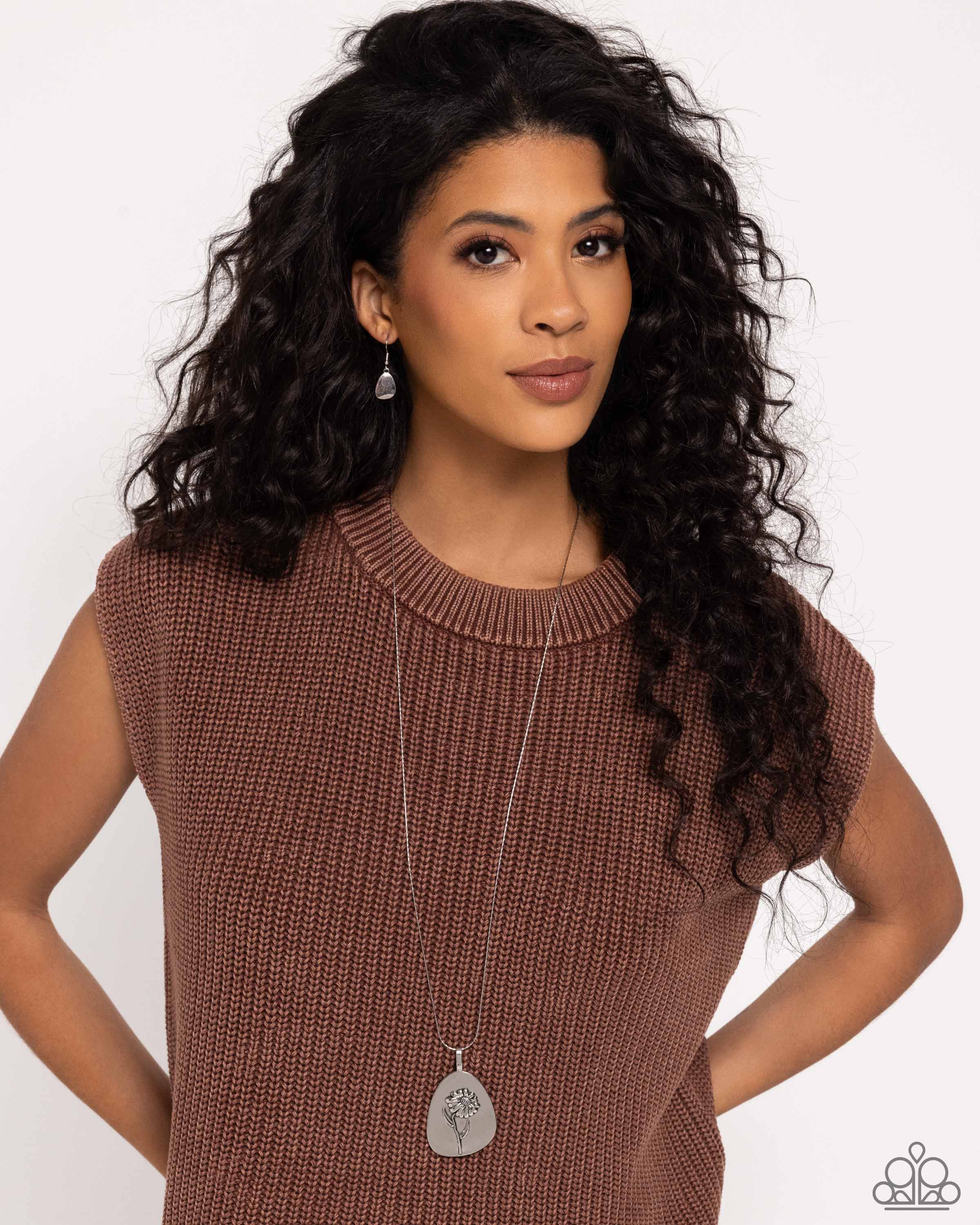 Embossed across an abstract, oversized silver teardrop pendant, a tactile silver sunflower blooms below the collar from a dainty silver cobra chain for a simply whimsical design. Features an adjustable clasp closure.